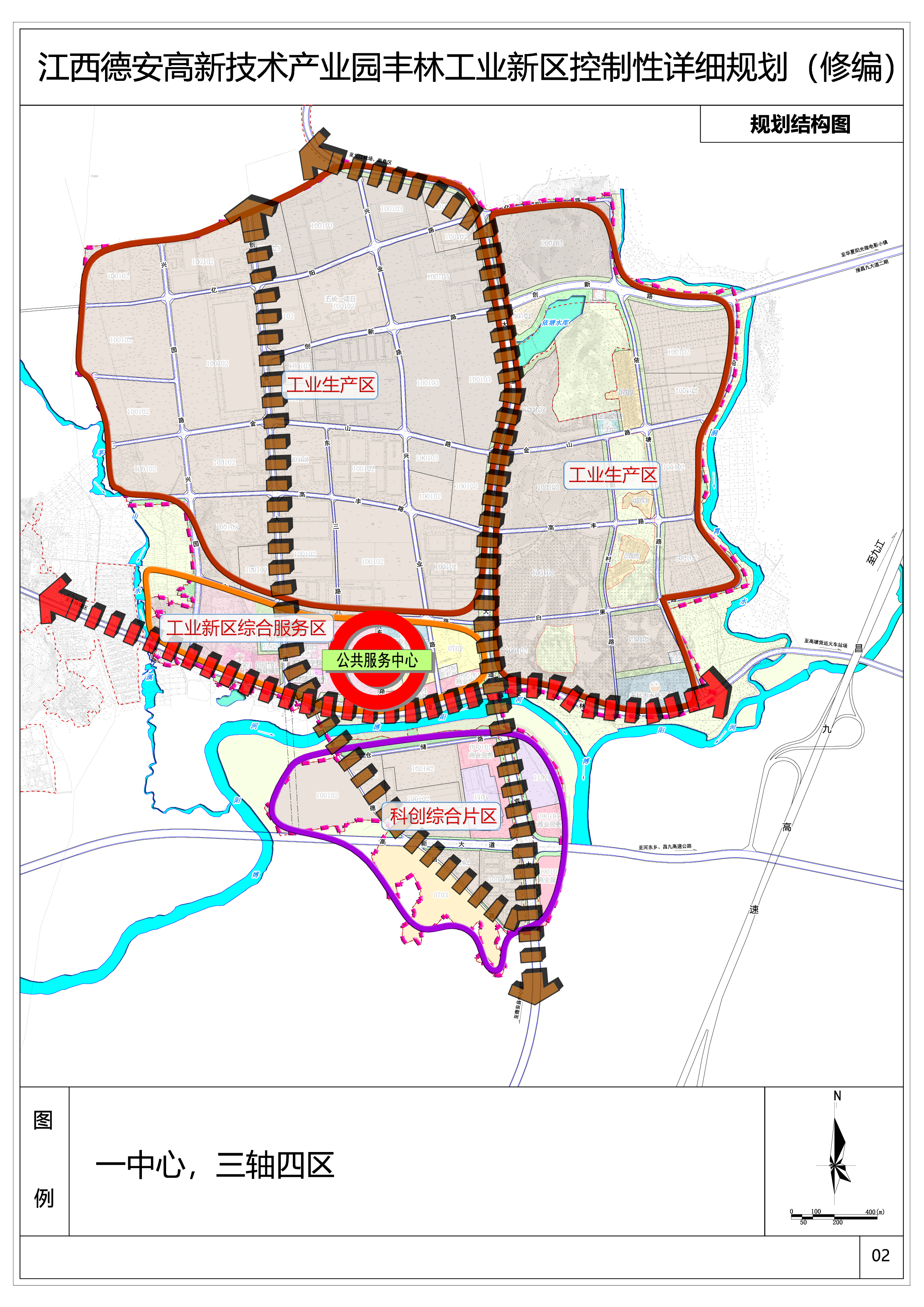一中心:即丰林工业新区综合服务中心。规划在创业大道与丰林大道交会处沿线,结合现状的德安职业技术学校,设置全区的产业服务中心,主要为产业服务配套相关功能,包括技能培训、科技研发、企业办公、酒店接待等。