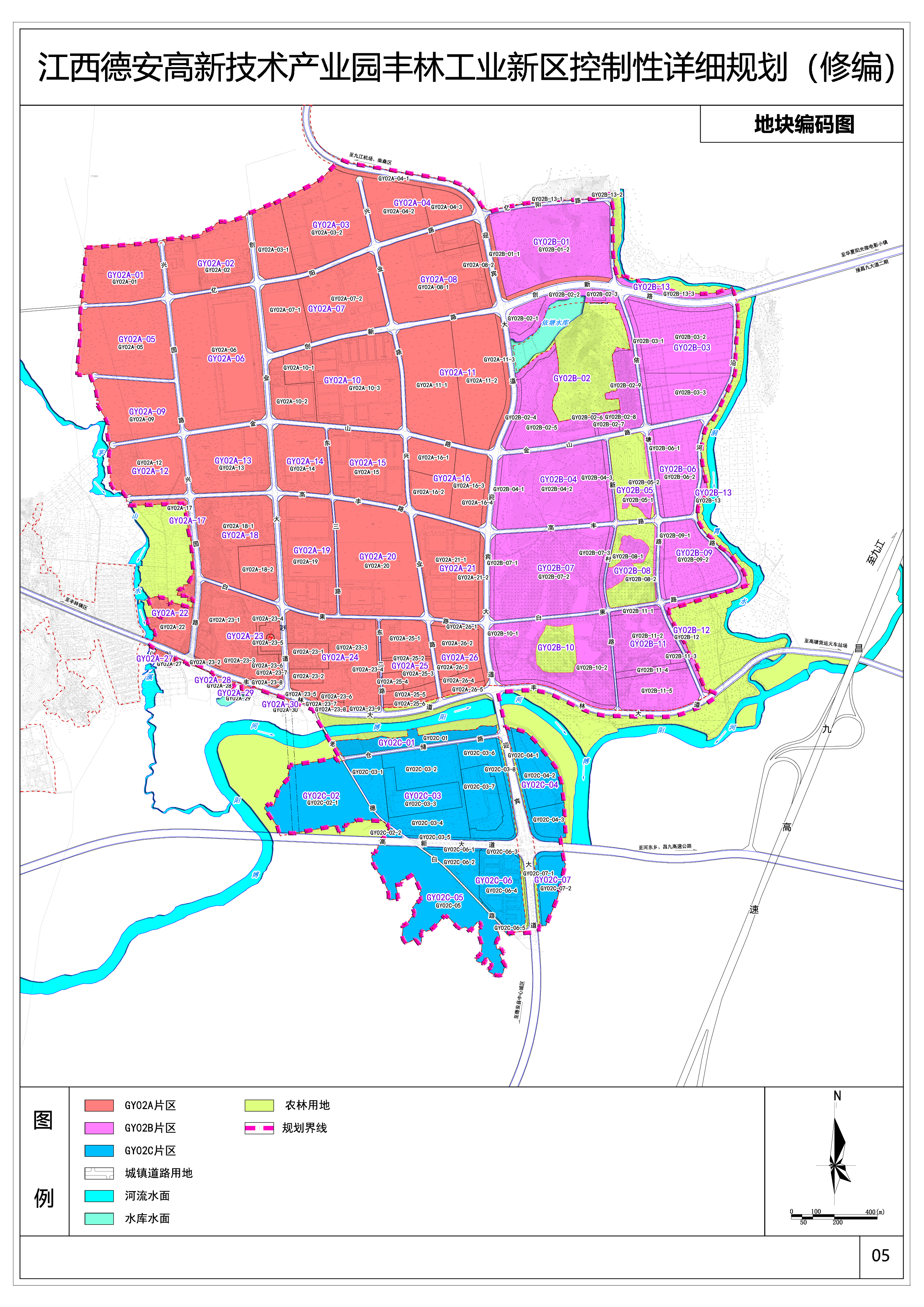 根据《德安县国土空间总体规划(2021—2035年)》中“中心城区详细规划编制单元图”,规划区为丰林工业园单元(编号:GY-02)。本次规划将规划区内用地以迎宾大道、博阳河为界,划分为GY02A、GY02B、GY02C等3个基础片区,再以基础片区内的道路为界,将各基础片区划分为若干个街坊,每个街坊内部再细分为连续单一性质的建设用地为一个单位地块。地块编号结构为三级,即“基础片区代号+街坊代码+地块序号”,例如:“GY02A-01-1”即表示规划GY02A基础片区第01街坊1号地块。