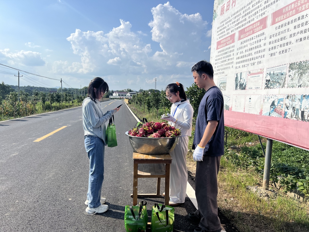 摘完果子,帮帮团顾不上休息,立即将火龙果运至乡主干道,支起临时售卖点。“自家种的火龙果,甜度高、水分足,6元1斤!”大家扯着嗓子吆喝,引得路人纷纷驻足,不一会儿,火龙果便售卖一空。