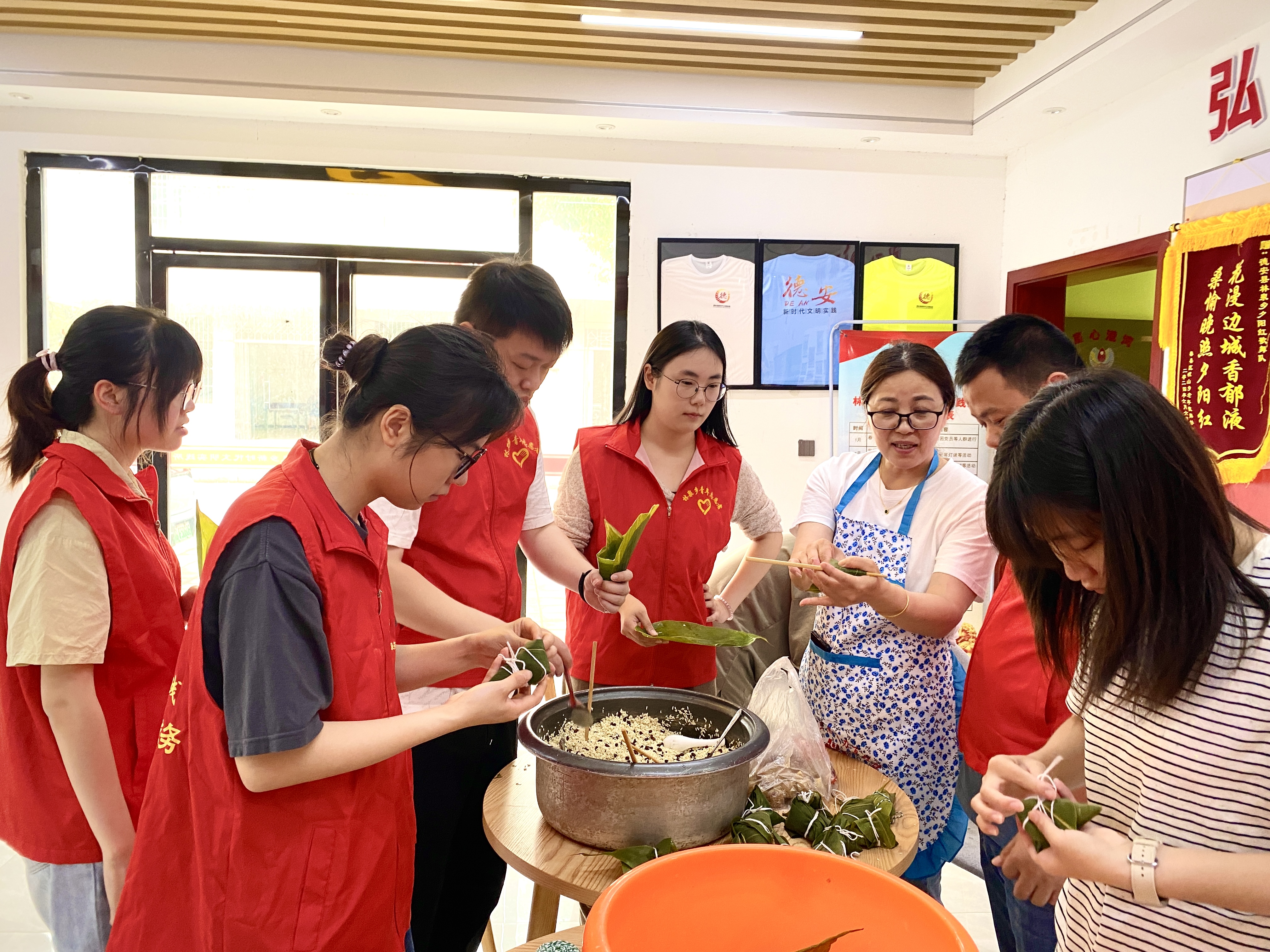 活动现场,志愿者们提前把清洗好的粽叶、糯米、甜枣、花生等包粽子的材料整齐地摆放在桌子上,大家分工协作、配合默契,拌糯米、折粽叶、装馅儿、裹扎绳,心灵手巧的志愿者们如同变戏法一般,一片片清香的粽叶、一粒粒香甜的糯米,在一双双巧手下,瞬间变成了一个个诱人的粽子,一些包粽子能手还耐心地向新手们传授包粽子的技巧和经验,活动现场洋溢着浓浓的节日气氛,不一会儿,一盆盆翠绿精致新鲜的粽子已包好。