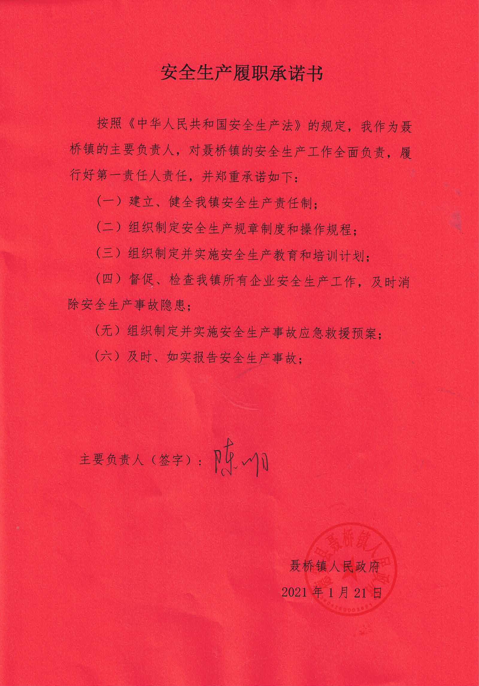 按照《中华人民共和国安全生产法》的规定,我作为聂桥镇的主要负责人,对聂桥镇的安全生产工作全面负责,履行好第一责任人责任,并郑重承诺如下: