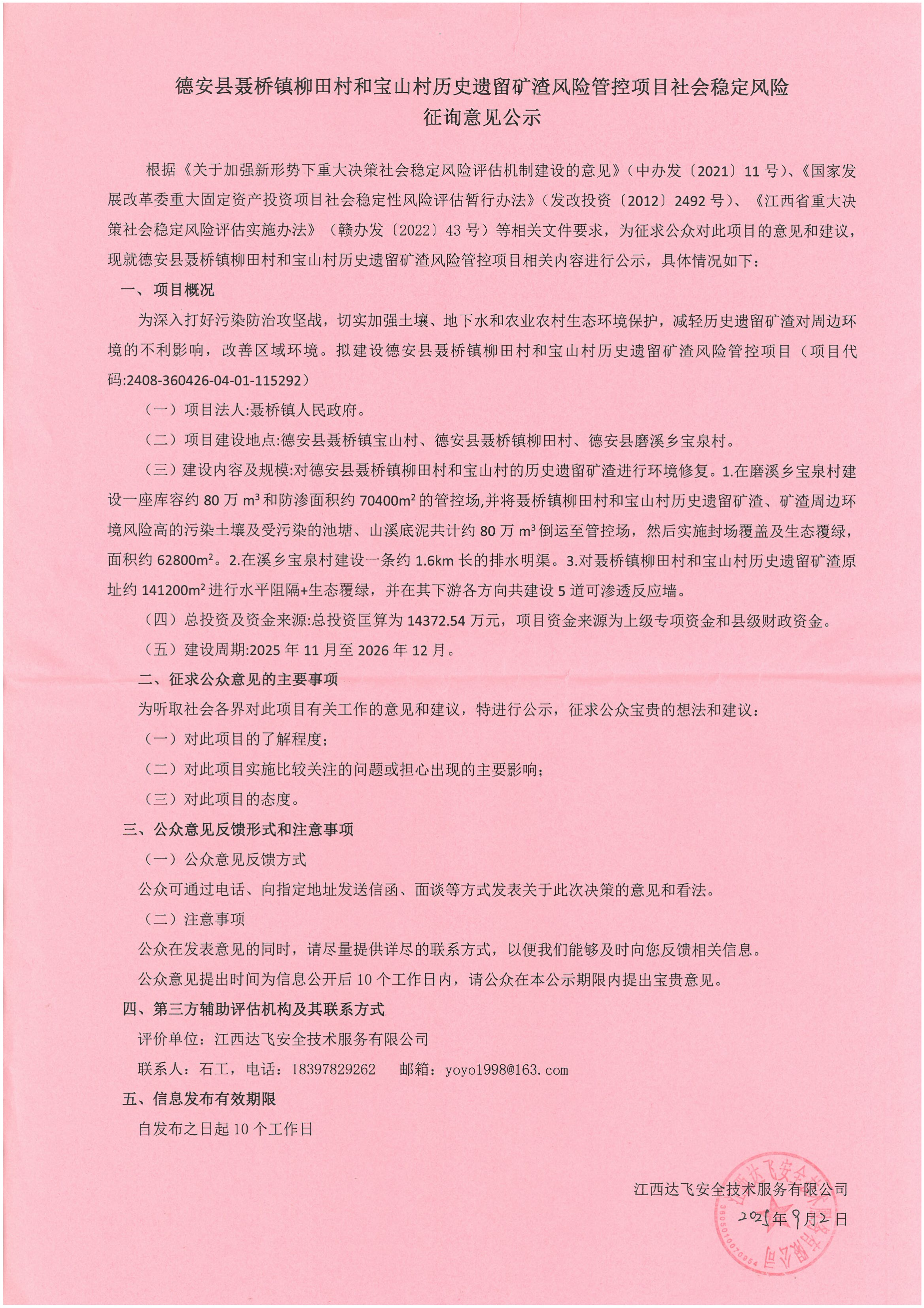 德安县聂桥镇柳田村和宝山村历史遗留矿渣风险管控项目社会稳定风险征询意见公示