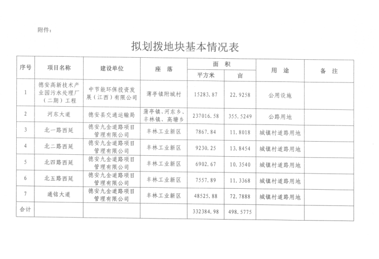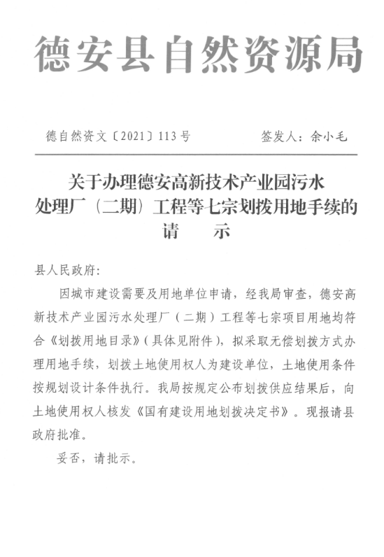 你局呈报的《关于办理德安高新技术产业园污水处理厂(二期)工程等七宗划拨用地手续的请示》(德自然资文〔2021〕113号)已收悉。经县政府研究决定,同意对该七宗建设项目用地办理无偿划拨用地手续。