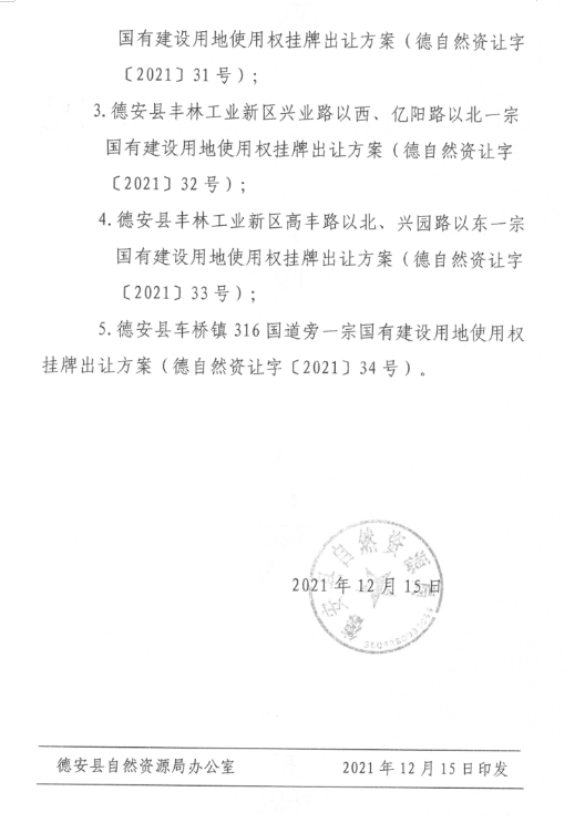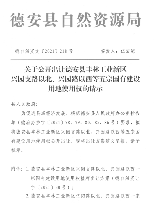 你单位呈报的《关于公开出让德安县丰林工业新区兴园支路以北、兴园路以西等五宗国有建设用地使用权的请示》(德自然资文〔2021〕218号)收悉。经县政府研究,同意你单位按所呈报的《德安县丰林工业新区兴园支路以北、兴园路以西一宗国有建设用地使用权挂牌出让方案》(德自然资让字〔2021〕30号)、《德安县丰林工业新区亿阳路以北、兴园路以西一宗国有建设用地使用权挂牌出让方案》(德自然资让字〔2021〕31号)、《德安县丰林工业新区兴业路以西、亿阳路以北一宗国有建设用地使用权挂牌出让方案》(德自然资让字〔2021〕32号)、《德安县丰林工业新区高丰路以北、兴园路以东一宗国有建设用地使用权挂牌出让方案》(德自然资让字〔2021〕33号)、《德安县车桥镇316国道旁一宗国有建设用地使用权挂牌出让方案》(德自然资让字〔2021〕34号)内容依法出让。