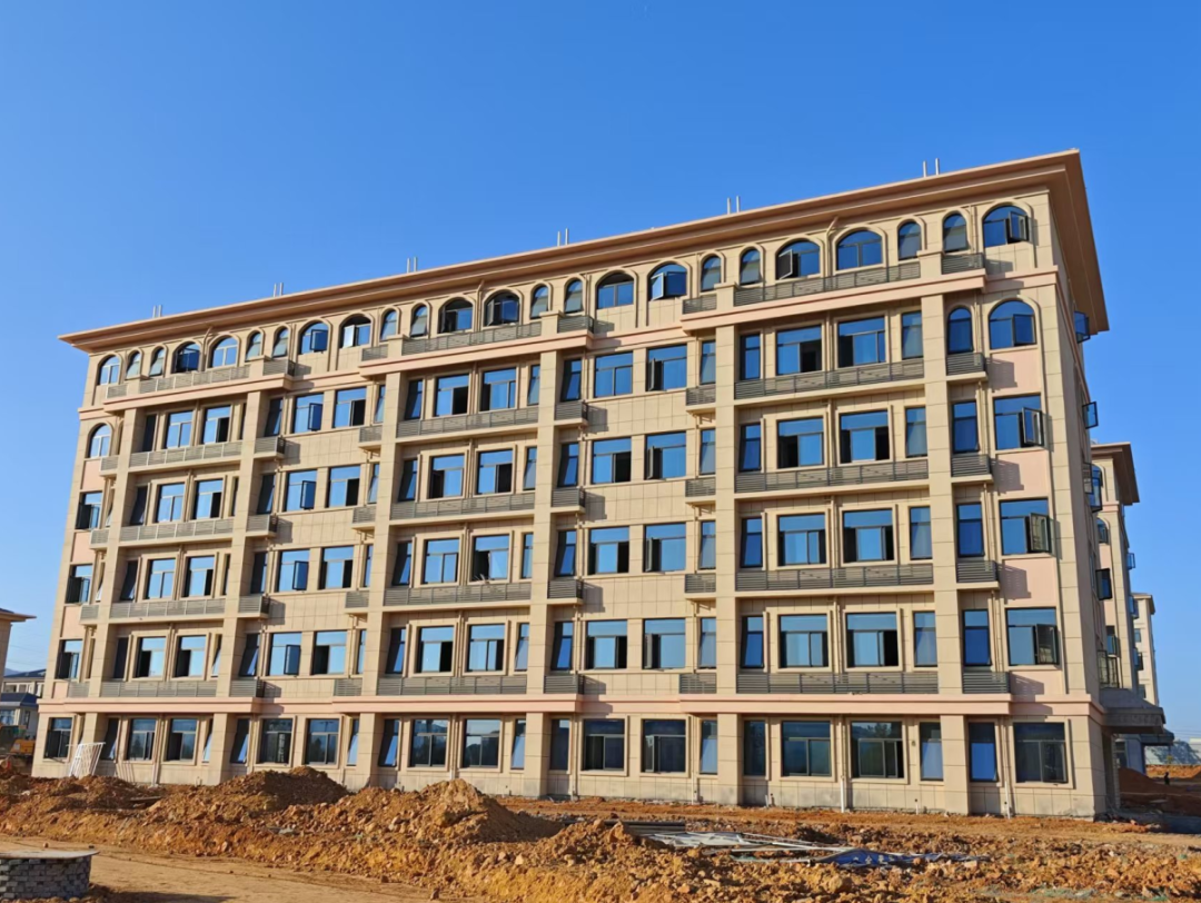 目前1#教学楼砌体施工完成、ALC内墙板安装完成95%、外墙抹灰施工完成、内墙抹灰施工完成60%、外墙保温施工完成20%、水电消防预埋完成70%、消防管道安装完成、地下室第一遍内墙腻子施工完成80%、屋面保温施工完成95%、屋面瓦龙骨施工完成20%;2#综合楼主楼内墙抹灰完成、第一遍内墙腻子施工完成70%、安装工程完成70%、卫生间防水施工完成、室内贴砖完成40%、外墙真石漆施工完成95%、屋面瓦龙骨施工完成、屋面瓦安装完成;多功能厅室内空调安装完成,窗玻璃安装60%;3#食堂砌体施工完成、屋窗框安装完成95%、水电预埋施工完成90%、屋面瓦施工完成、外墙抹灰完成30%;4#宿舍楼内墙二遍腻子完成90%、墙地砖施工完成,楼梯扶手安装完成、卫生间吊顶施工完成20%、顶层吊顶完成30%、卫生间洗手台安装完成50%;5#宿舍楼内墙二遍腻子完成90%、墙地砖施工完成,楼梯扶手安装完成、卫生间吊顶施工完成20%、顶层吊顶完成30%、卫生间洗手台安装完成50%;6#实训中心内墙一遍腻子施工完成、窗玻璃安装完成85%、楼地面砖(卫生间)施工完成、1-2层地面找平施工完成、楼道砖完成90%、楼梯砖完成70%、安装工程完成60%;7#大门混凝土浇筑完成;4、5、6号楼室外给水、消防给水、强电管道安装完成95%。