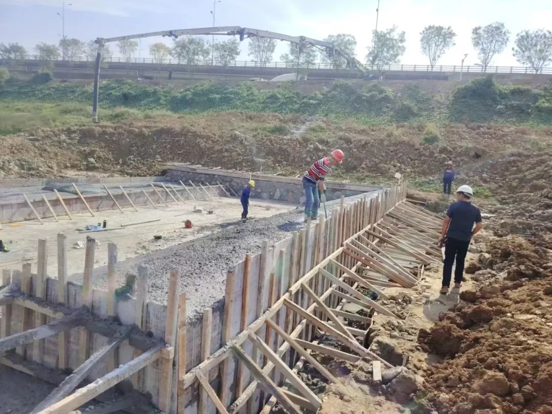 目前网格絮凝平流沉淀池排泥沟混凝土浇筑完成,普通快滤池主体结构混凝土浇筑完成,2.5千米管网已施工完成;机修仓库主体结构混凝土浇筑完成;送水泵房水泵基础浇筑完成25%,送水泵房配电间电缆沟改造完成;排水排泥池改造完成50%。