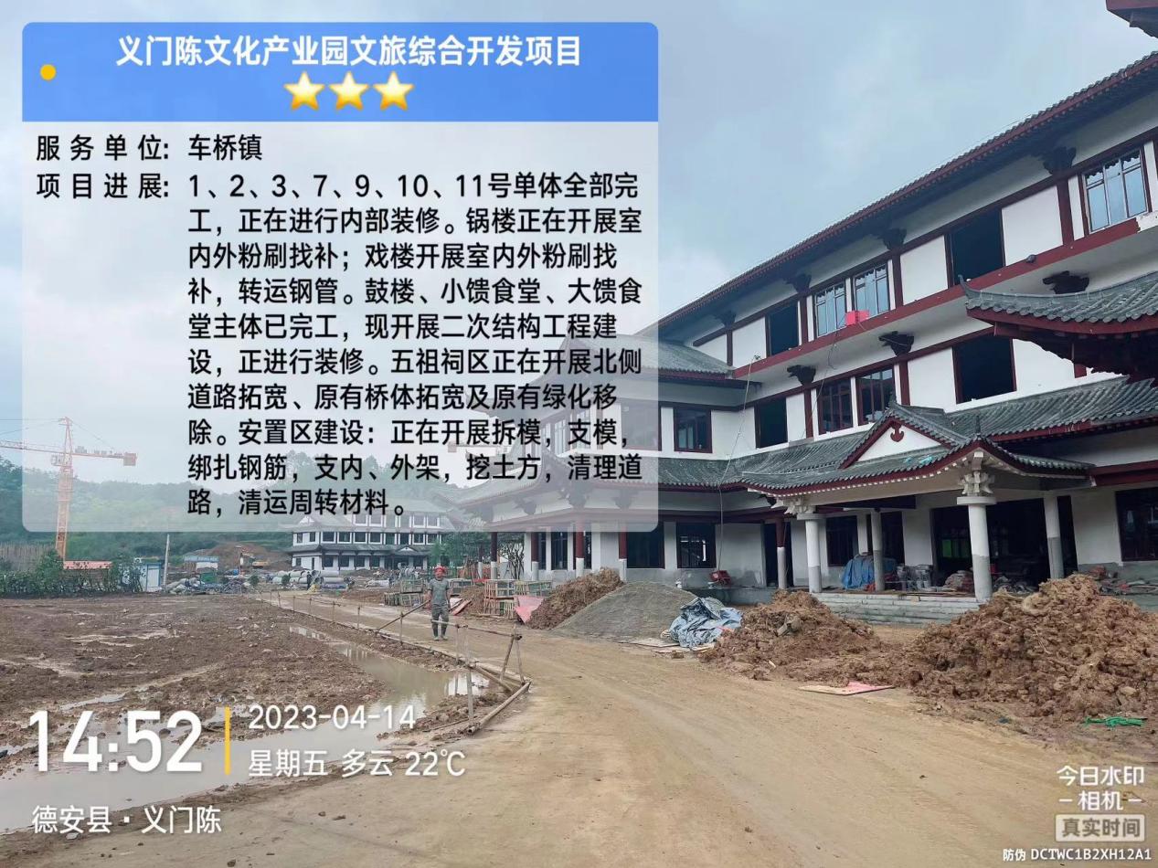 进展:家风广场区单体建设: 1、2、3、7、9、10、11号单体全部完工,正在进行内部装修。馈食堂区单体建设:锅楼正在开展室内外粉刷找补;戏楼开展室内外粉刷找补,转运钢管。鼓楼、小馈食堂、大馈食堂主体已完工,现开展二次结构工程建设,正进行装修。五祖祠区建设:正在开展北侧道路拓宽、原有桥体拓宽及原有绿化移除。安置区建设:正在开展拆模,支模,绑扎钢筋,支内、外架,挖土方,清理道路,清运周转材料。