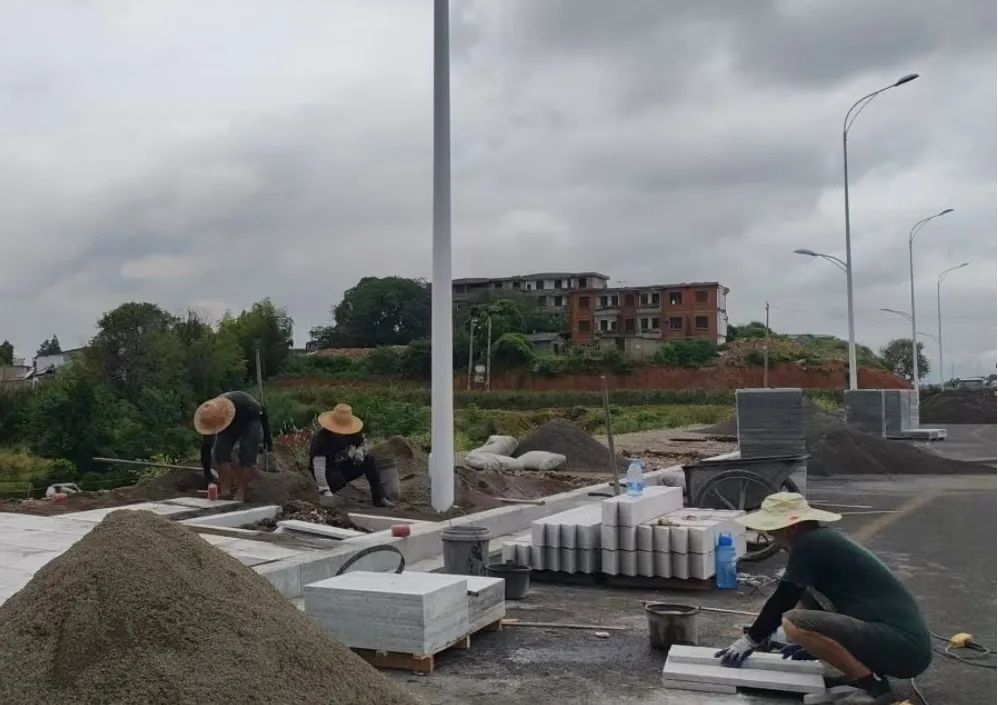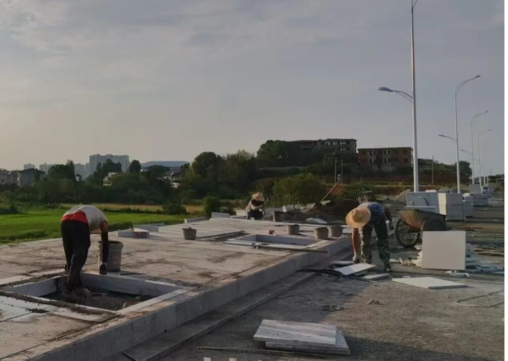 目前正在进行人行道砖铺贴,路面沥青剩余面层暂未施工待人行道施工完成后进行摊铺。