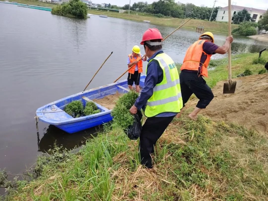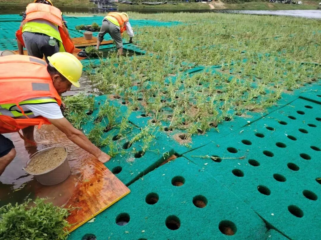 目前挺水植物K5+700.0到K6+400.0河段种植完成;尾水塘正在进行生态浮床安装;隆平湖正在进行沉水植物种植。