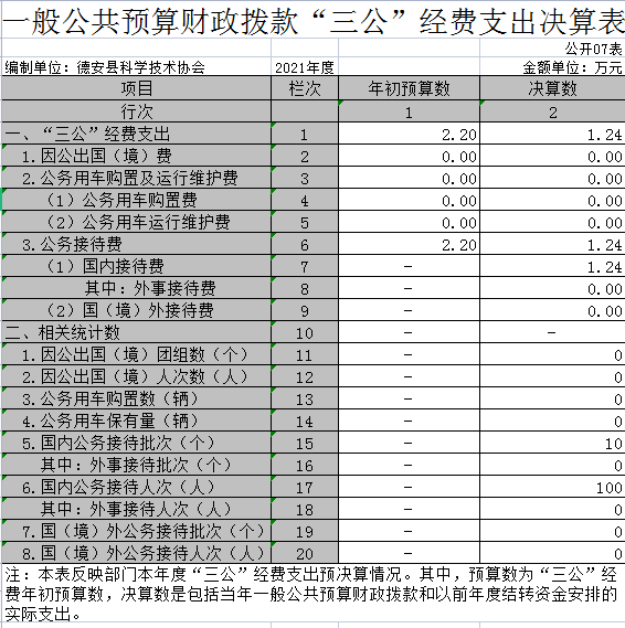 2021年度“三公”经费财政预算数合计为3万元,其中公务接待费3万元,公务用车运行维护费0万元,因公出国(境)费用0万元。