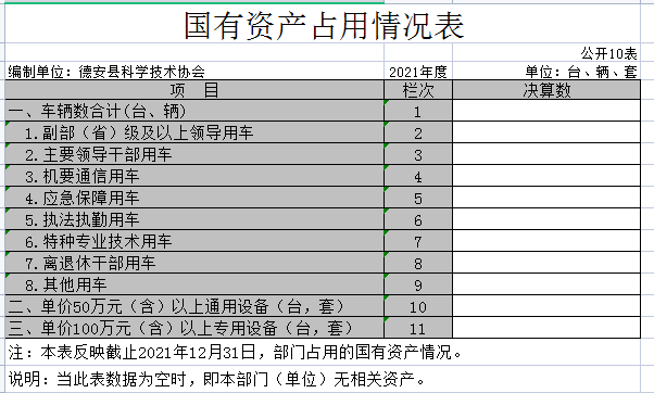 截至2021年12月31日,本部门(单位)国有资产占用情况见公开10表《国有资产占用情况表》。本部门共有车0辆。其中副部(省)级及以上领导用车0辆、主要领导干部用车0辆、机要通信用车0辆、应急保障用车0辆、执法执勤用车0辆、特种专业技术用车0辆、其他用车0辆,其他用车0辆;单位价值50万元以上通用设备0台(套);单位价值100万元以上专用设备0台(套)。主要原因是:无国有资产占用情况。