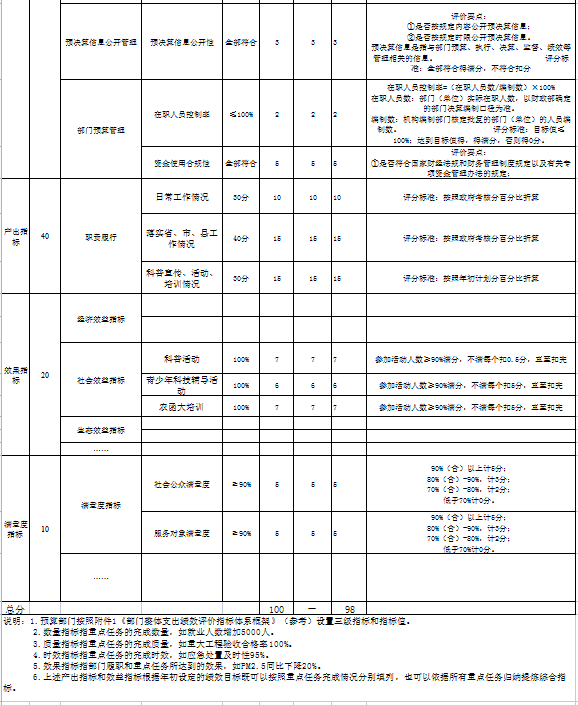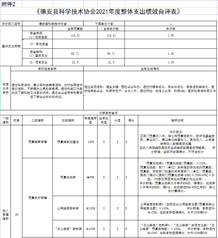 根据部门整体支出绩效评价指标规定的内容,经综合评价,德安县科学技术协会2021年度整体支出绩效评价分数为98分,具体评分如附件所示。