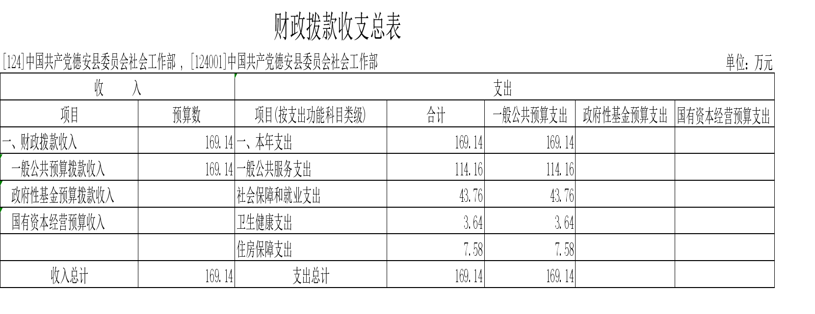 2025年中国共产党德安县委员会社会工作部财政拨款支出预算总额169.14万元,较上年预算安排增加169.14万元;