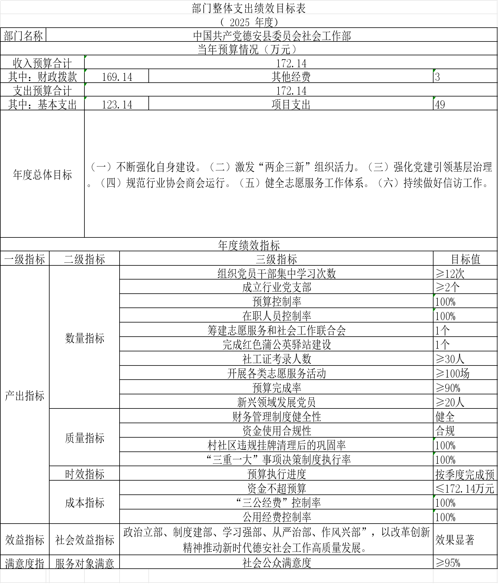 2025年中国共产党德安县委员会社会工作部支出预算总额为172.14万元,较上年预算安排增加172.14万元;其中: