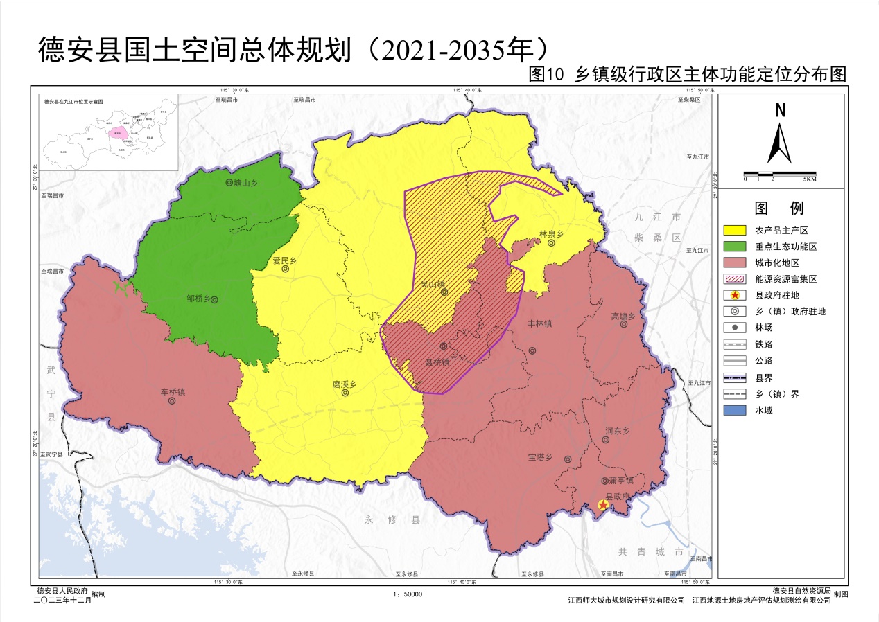 落实省级国土空间规划确定的主体功能分区,德安县为城市化地区,将德安县13个乡镇划分为不同的主体功能区。其中,磨溪乡、爱民乡、林泉乡和吴山镇为农产品主产区;邹桥乡和塘山乡为重点生态功能区;蒲亭镇、丰林镇(包括彭山公益林场)、车桥镇、聂桥镇、宝塔乡(包括向阳山生态林场)、河东乡、高塘乡为城市化地区。