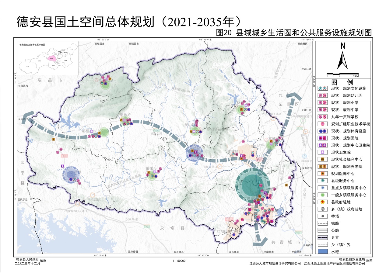 结合德安县实际情况,构建“三级”公共服务设施体系。“三级”是指中心城区、重点镇级和一般乡镇级。公共服务设施按照“三级”体系配置教育、医疗、体育、文化、社会福利等设施,服务于中心城区和各乡镇,带动空间布局优化调整。