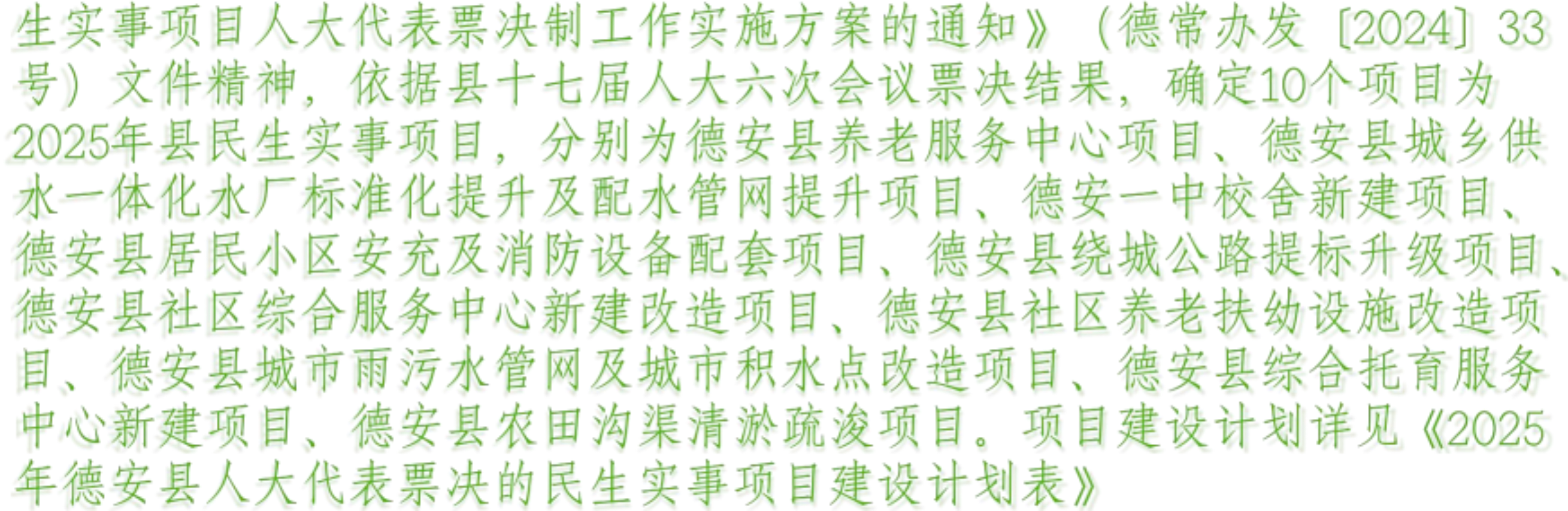 | 项目背景政策依据 依据《县人大常委会办公室 县人民政府办公室关于印发德安县2025年民生实事项目人大代表票决制工作实施方案的通知》(德常办发〔2024〕33号)文件精神开展项目票决工作。 |