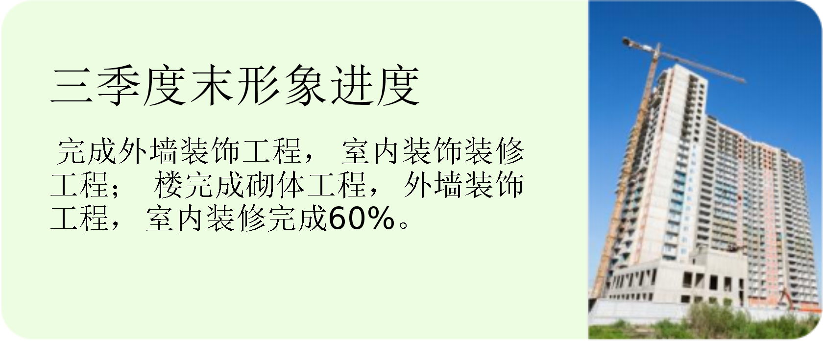 三季度进度 德安一中校舍新建项目三季度完成土建施工;德安县养老服务中心项目楼完成外墙装饰工程,室内装饰装修工程,楼完成砌体工程,外墙装饰工程,室内装修完成60%。 |
