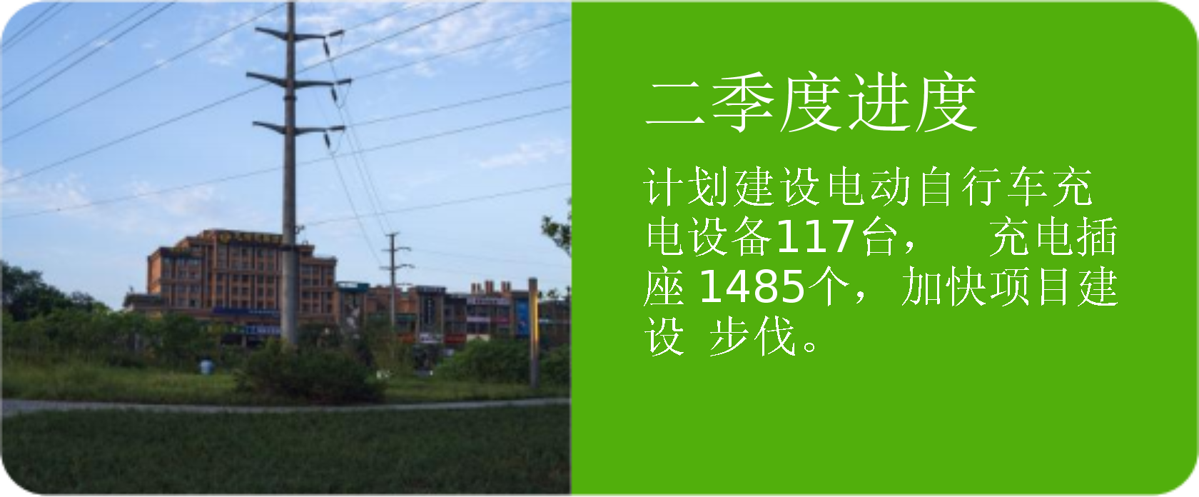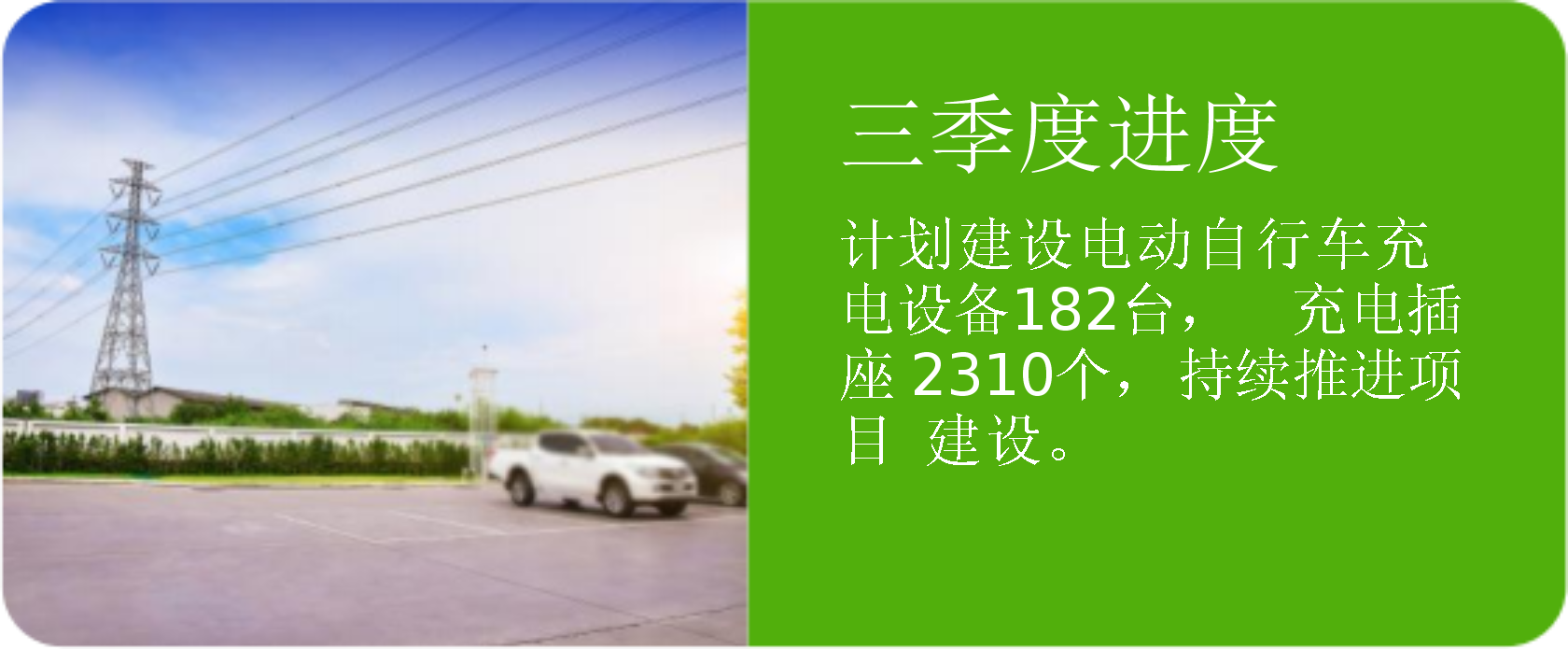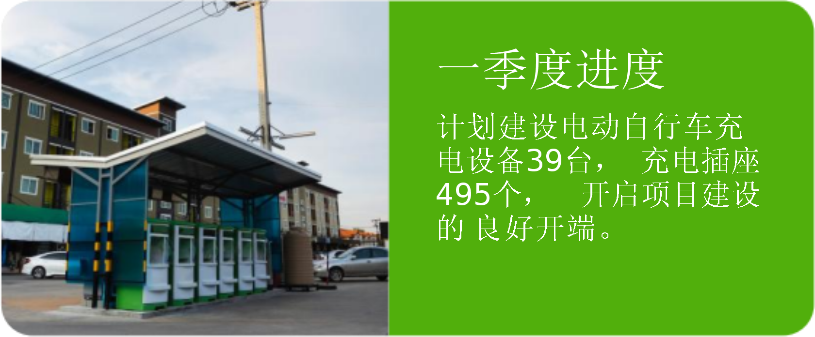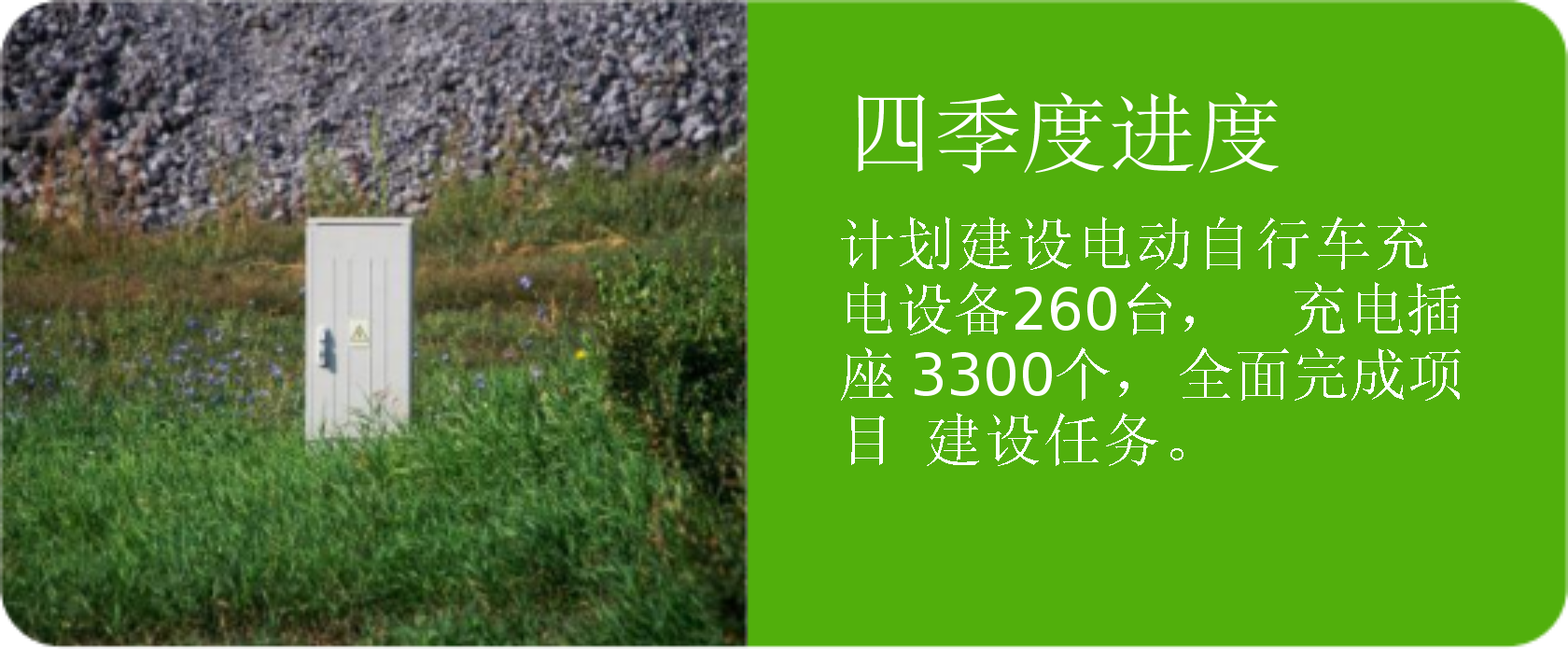 四季度进度 德安一中校舍新建项目四季度装修安装工程完工;德安县居民小区安充及消防设备配套项目计划建设电动自行车充电设备260台,充电插座3300个。 |