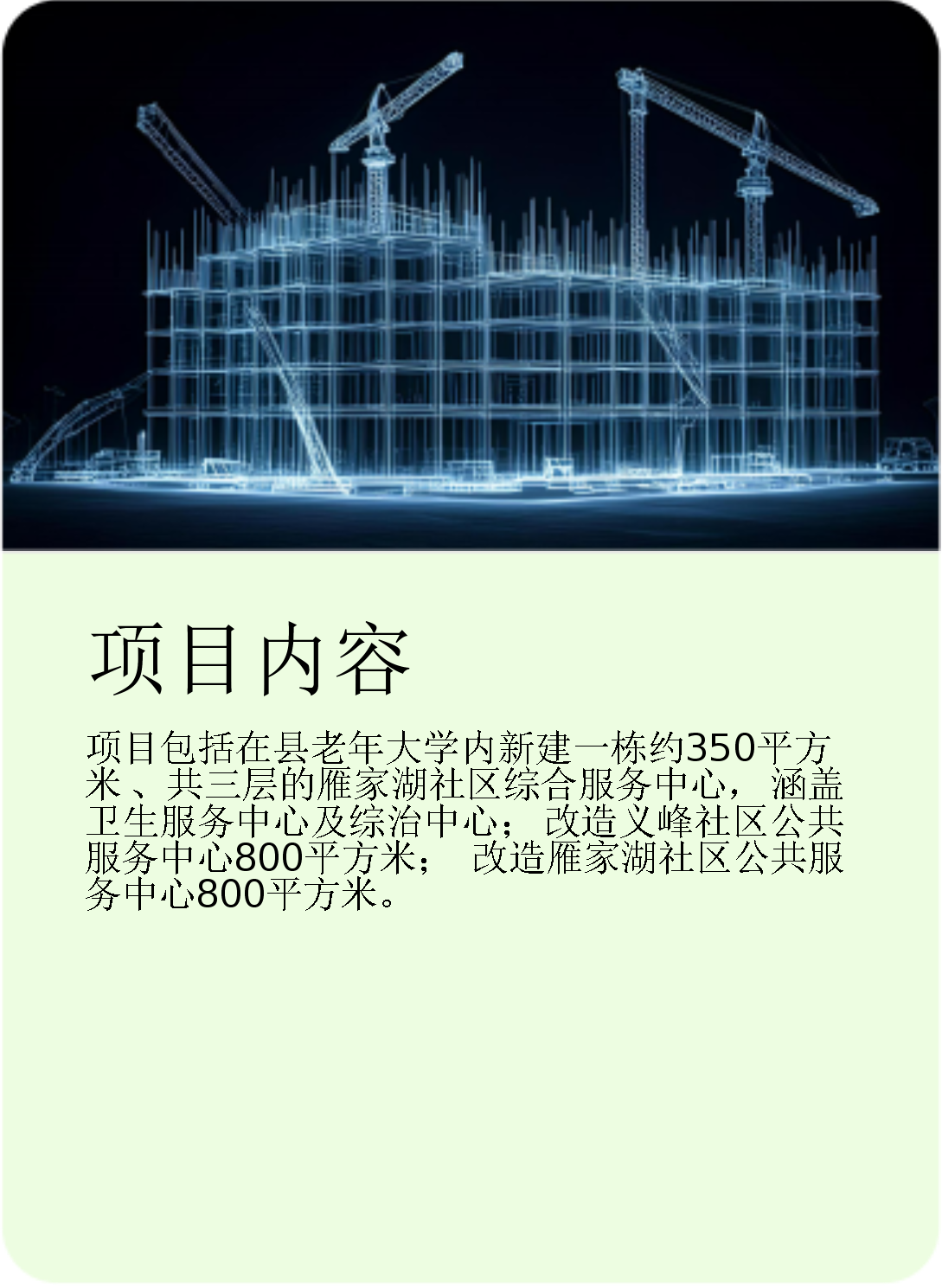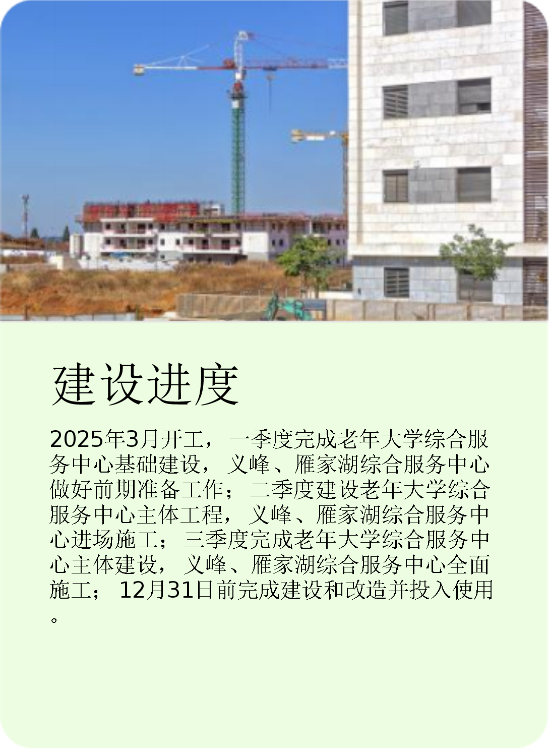 | 改造内容 改造义峰社区养老扶幼设施800平方米,设置日间照料床位30个,社区医疗卫生站150平方米;改造雁家湖社区养老扶幼设施800平方米,设置日间照料床位30个,社区医疗卫生站 150平方米。 | 进度安排 2025年3月开工,一季度做好义峰、雁家湖养老扶幼设施建设施工前准备工作;二季度做好改造基础工作;三季度全面开展建设;12月31日前完成 建设并投入使用。 | 投资与责任单位 项目总投资300万元,责任单位为住建局。 |