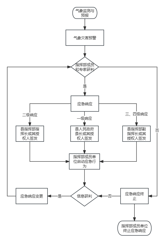 (4)根据县指挥部决定,负责启动、变更或终止气象灾害应急响应;