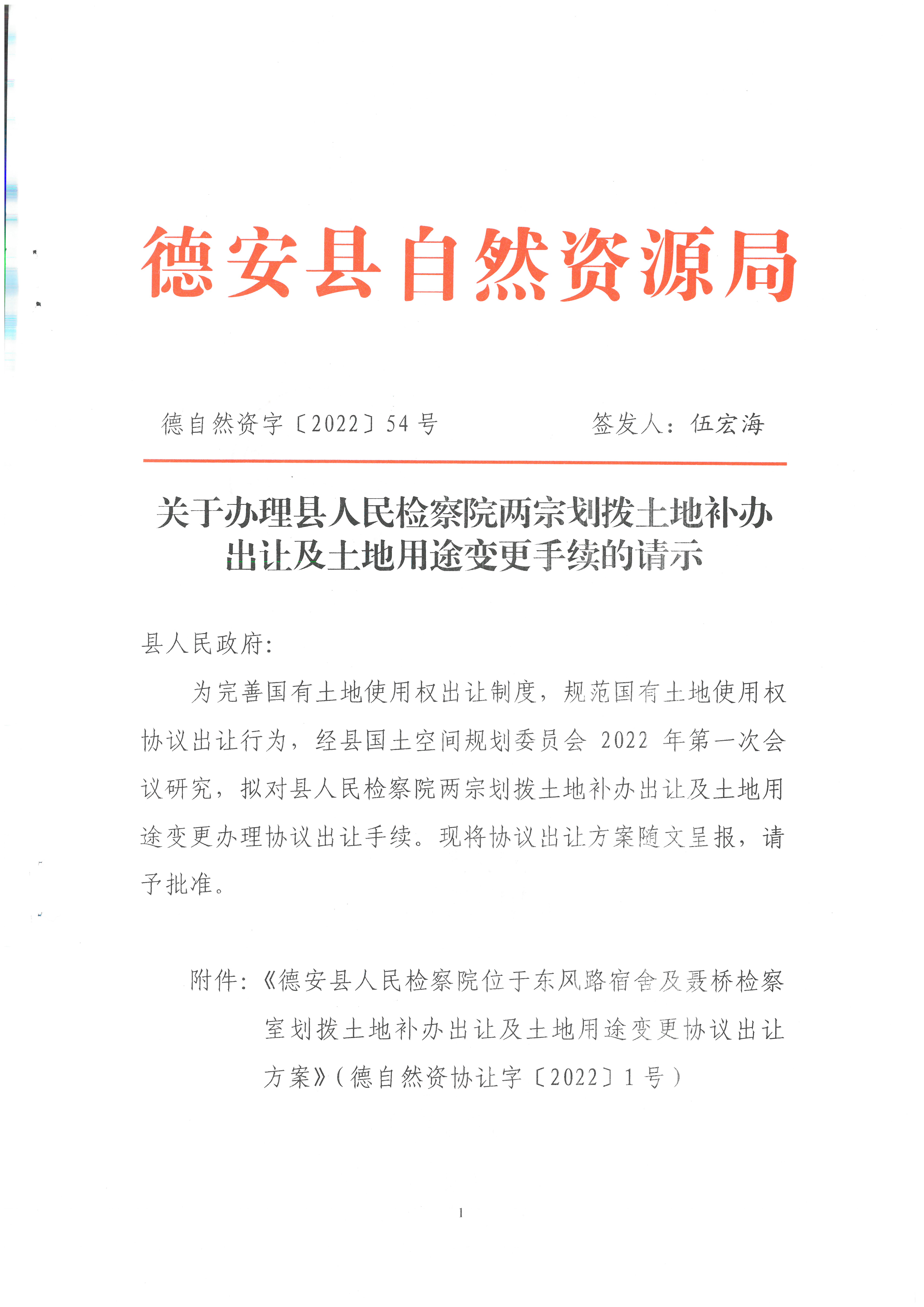 你单位呈报的《关于办理县人民检察院两宗划拨土地补办出让及土地用途变更手续的请示》(德自然资文〔2022〕54号)收悉。经县政府研究,同意你单位按所呈报的《德安县人民检察院位于东风路宿舍及聂桥检察室划拨土地补办出让及土地用途变更协议出让方案》(德自然资协让字〔2022〕1号)内容依法组织出让。