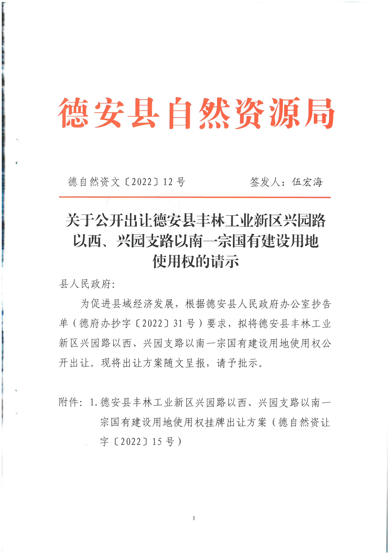 你单位呈报的《关于公开出让德安县丰林工业新区兴园路以西、兴园支路以南一宗国有建设用地使用权的请示》(德自然资文〔2022〕12号)收悉。经县政府研究,同意你单位按所呈报的《德安县丰林工业新区兴园路以西、兴园支路以南一宗国有建设用地使用权挂牌出让方案》(德自然资让字〔2022〕15号)内容依法出让。