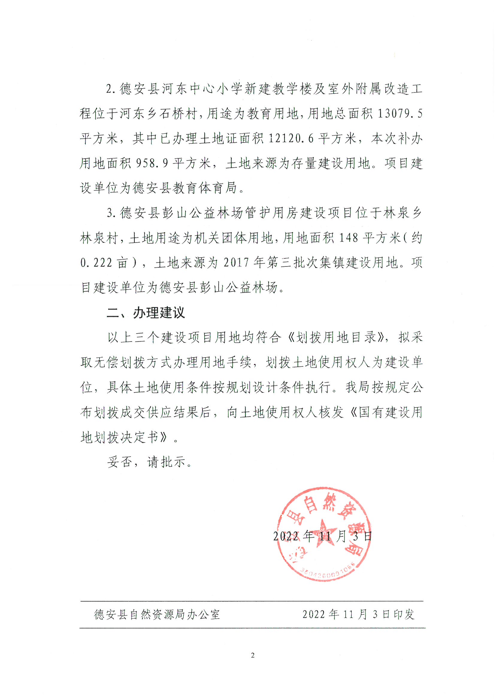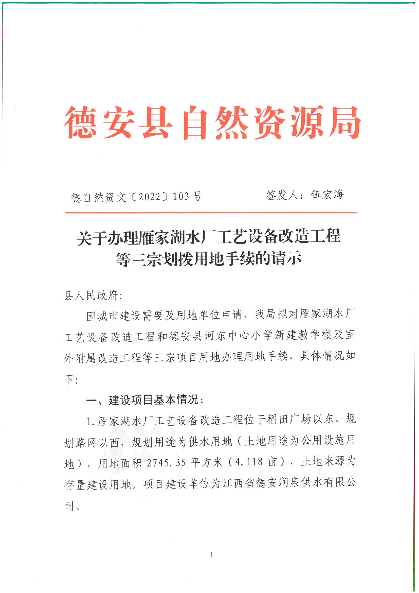 你局呈报的《关于办理雁家湖水厂工艺设备改造工程等三宗划拨用地手续的请示》(德自然资字〔2022〕103号)已收悉。经县政府研究决定,同意对该三宗建设项目用地办理无偿划拨用地手续,划拨土地使用权人为建设单位。