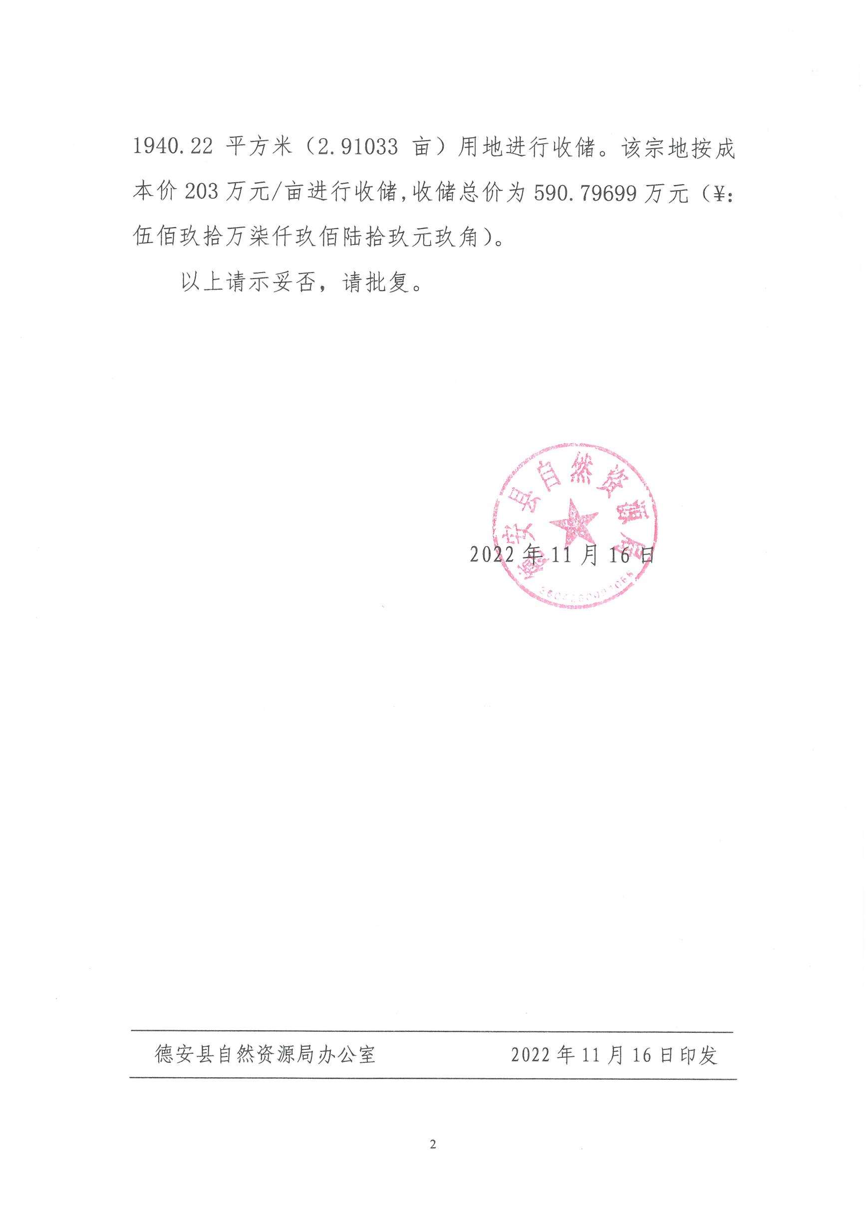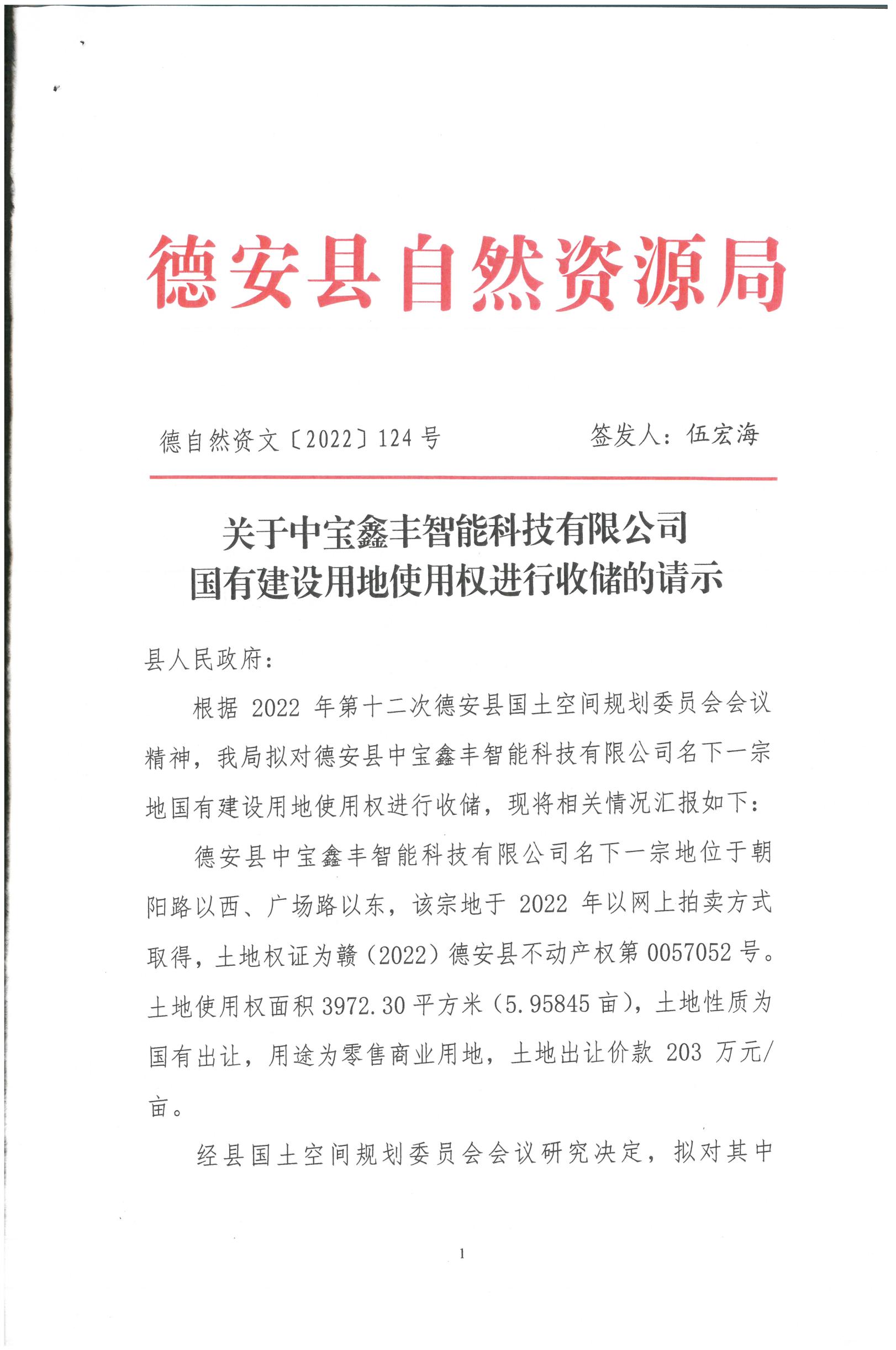 你单位呈报的《关于德安县中宝鑫丰智能科技有限公司国有建设用地使用权进行收储的请示》(德自然资文〔2022〕124号)已收悉。经县政府研究,同意你单位收储请求,请你单位依法做好相关收储工作。