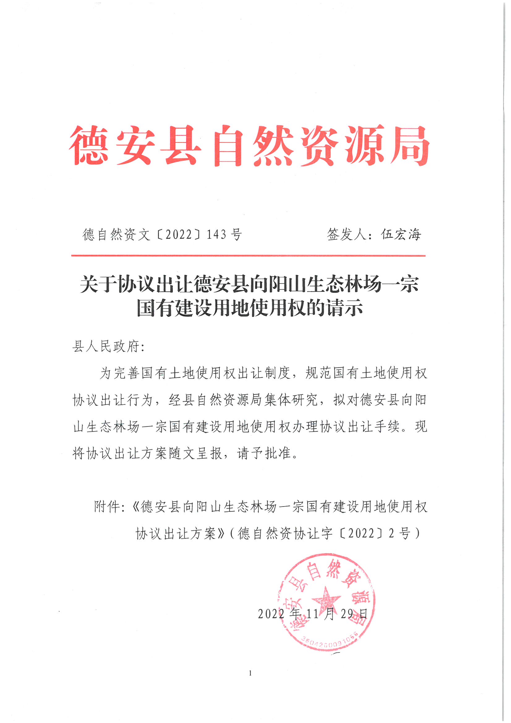 你单位呈报的《关于协议出让德安县向阳山生态林场一宗国有建设用地使用权的请示》(德自然资文〔2022〕143号)收悉。经县政府研究,同意你单位按所呈报的《德安县向阳山生态林场一宗国有建设用地使用权协议出让方案》(德自然资协让字〔2022〕2号)内容依法组织出让。