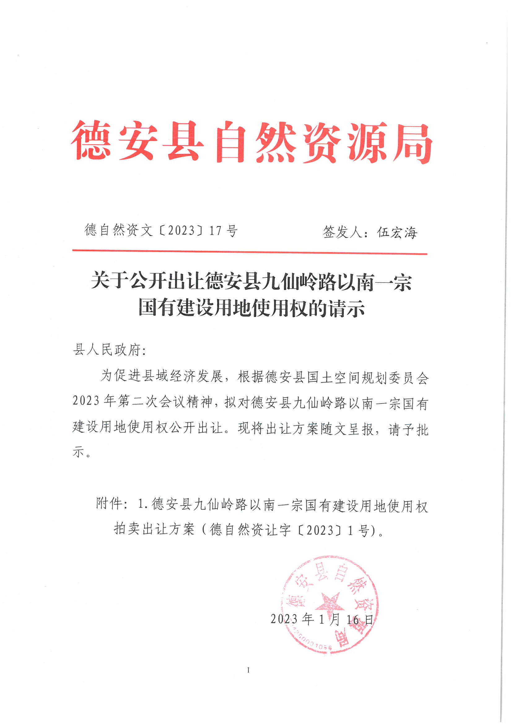 你单位呈报的《关于公开出让德安县九仙岭路以南一宗国有建设用地使用权的请示》(德自然资文〔2023〕17号)收悉。经研究,同意你单位按所呈报的《德安县九仙岭路以南一宗国有建设用地使用权拍卖出让方案》(德自然资让字〔2023〕1号)内容依法出让。