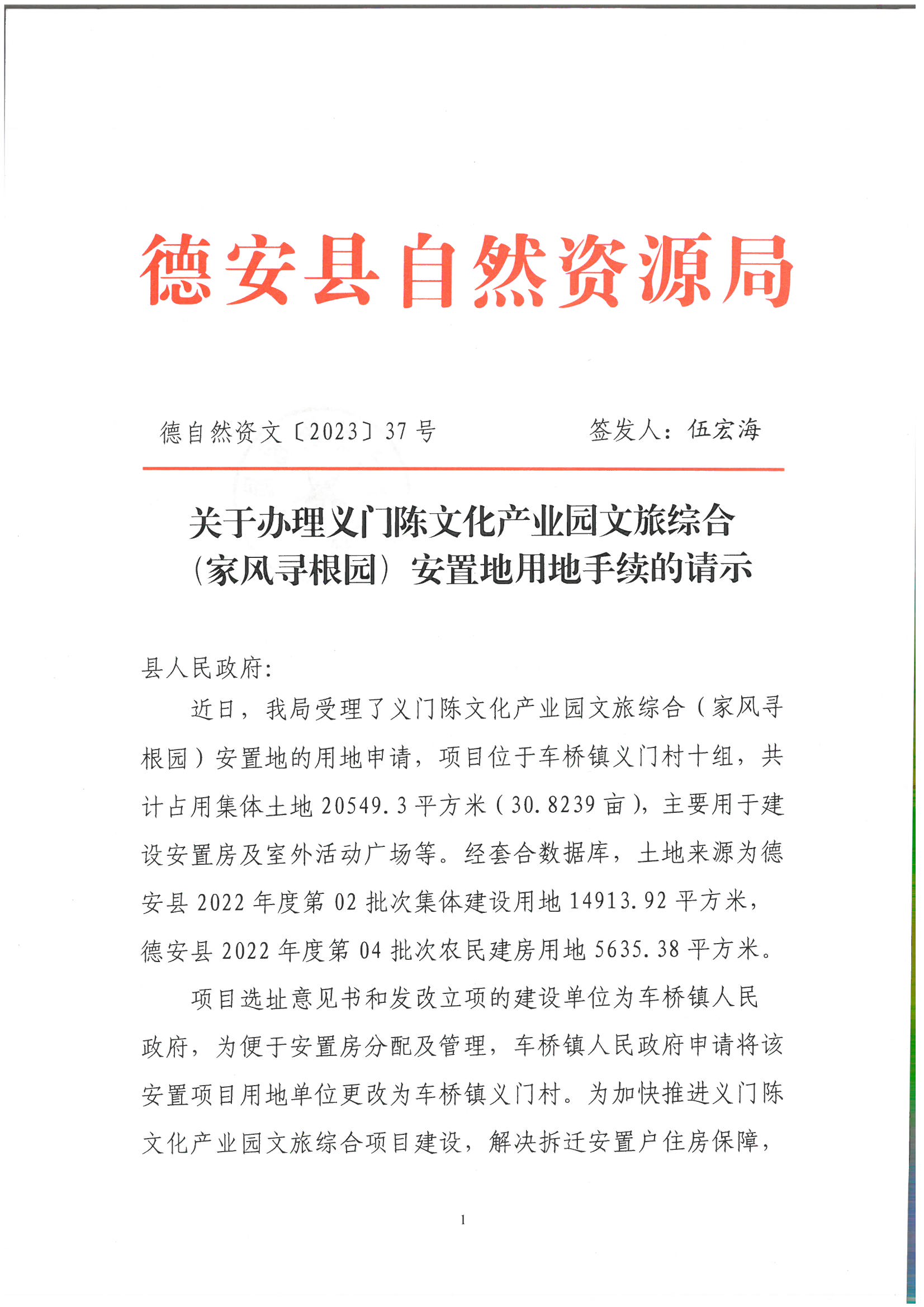 你单位呈报的《关于办理义门陈文化产业园文旅综合(家风寻根园)安置地用地手续的请示》(德自然资文〔2023〕37号)收悉。经研究决定,现批复如下: