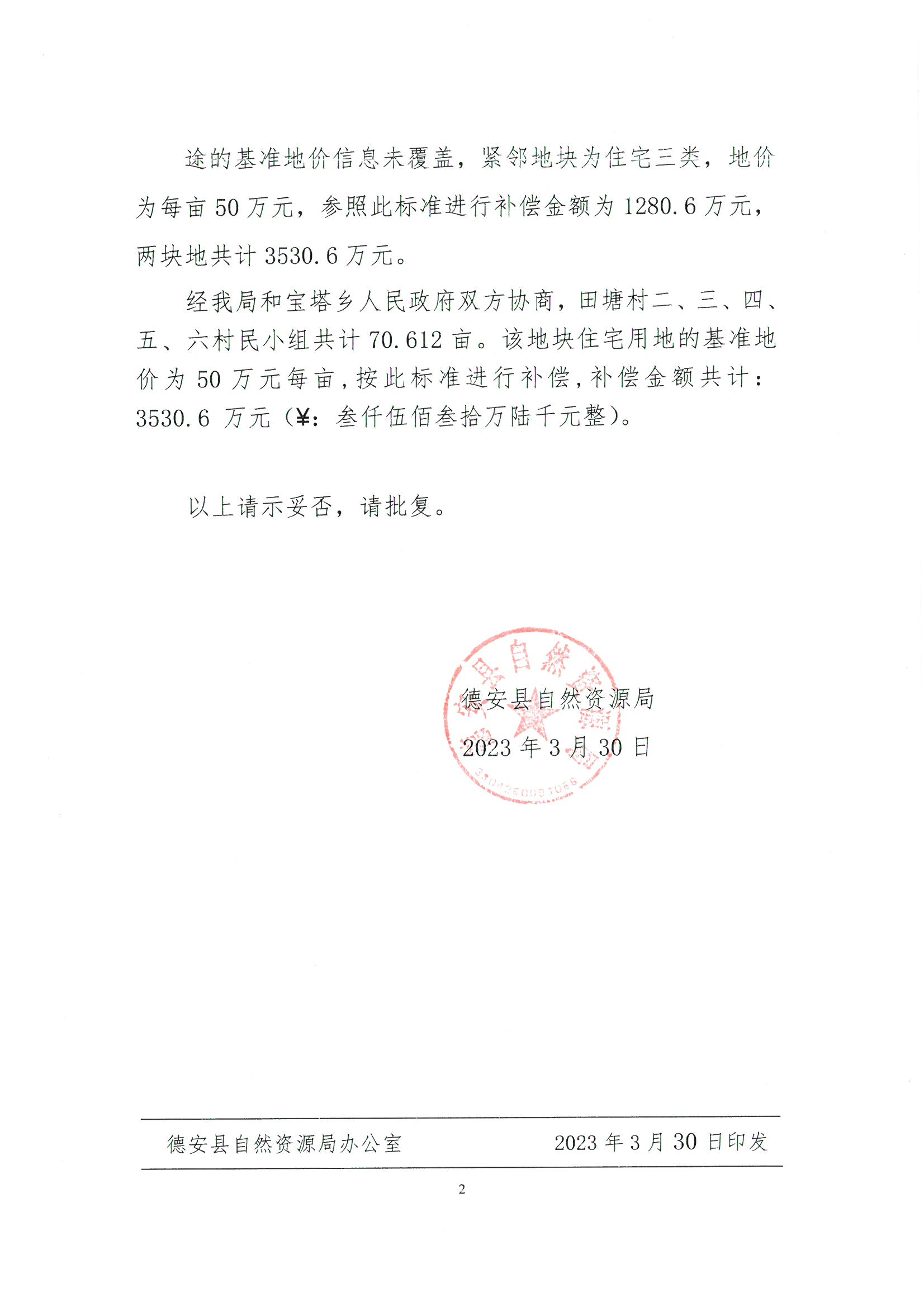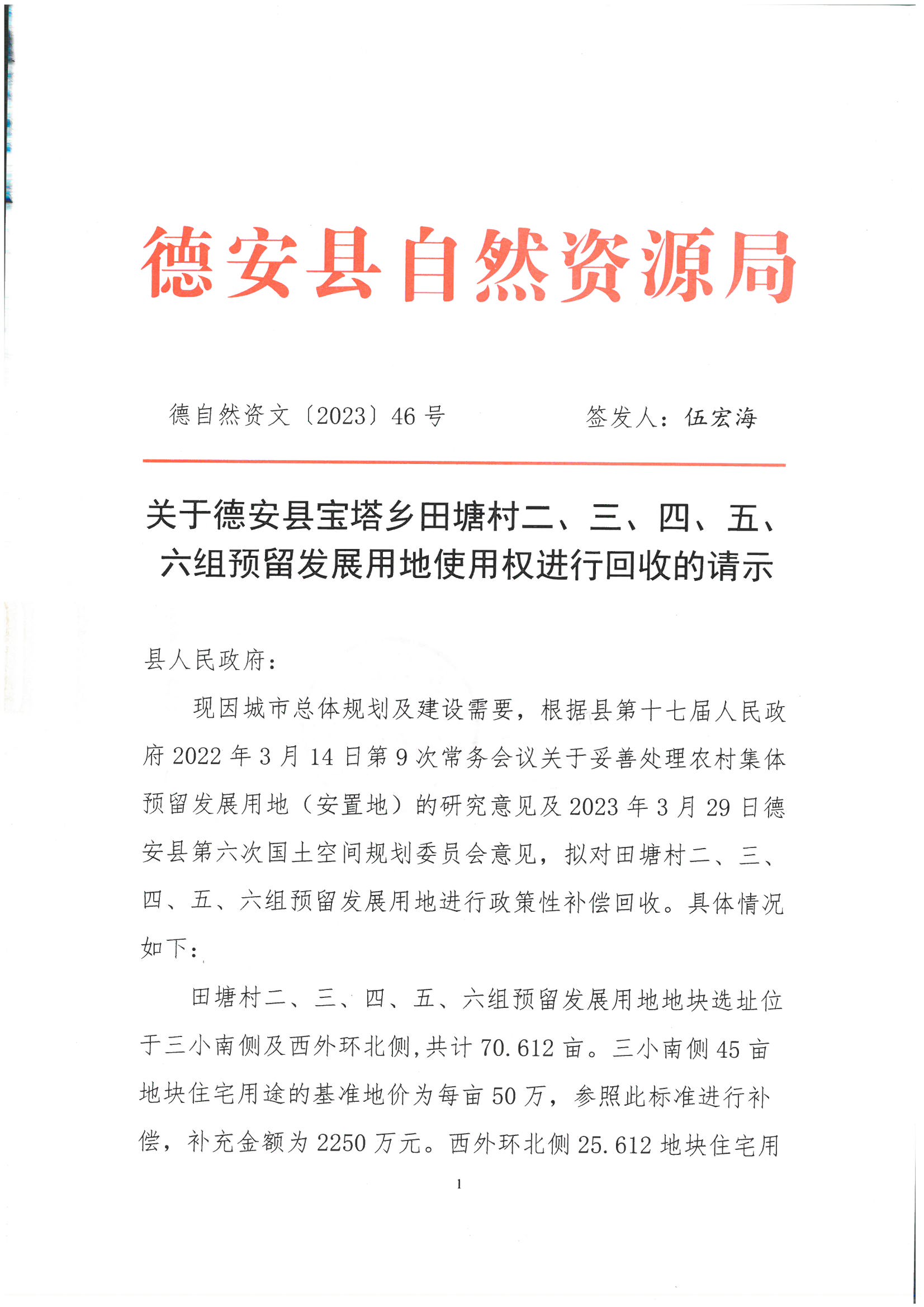 你单位呈报的《关于德安县宝塔乡田塘村二、三、四、五、六组预留发展用地使用权进行回收的请示》(德自然资文〔2023〕46号)已收悉。经县政府研究,同意你单位请求,请依法做好相关工作。