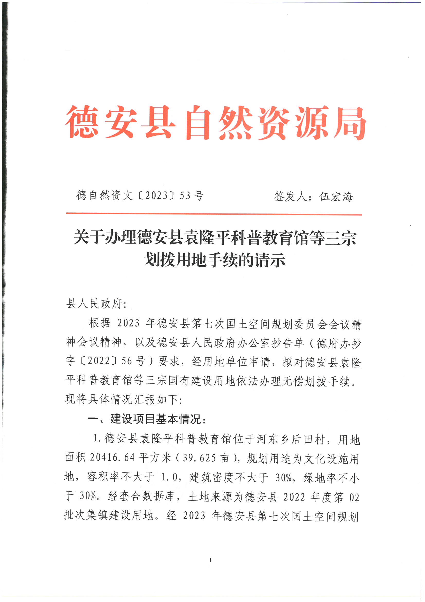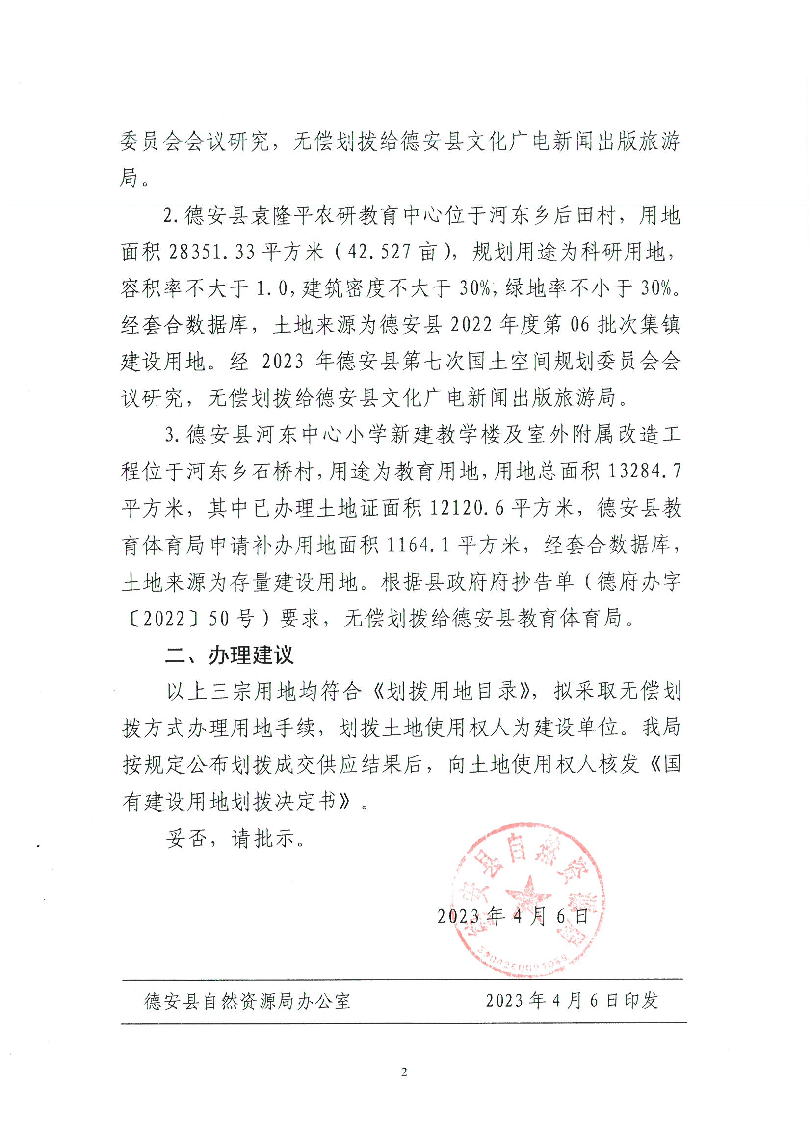 你局呈报的《关于办理德安县袁隆平科普教育馆等三宗划拨用地手续的请示》(德自然资文〔2023〕53号)已收悉。经县政府研究决定:1.同意办理袁隆平科普教育馆项目无偿划拨用地手续,土地使用权人为德安县文化广电新闻出版旅游局;2.同意办理袁隆平农研教育中心项目无偿划拨用地手续,土地使用权人为德安县文化广电新闻出版旅游局;3.同意办理河东中心小学新建教学楼及室外附属改造工程无偿划拨用地手续,土地使用权人为德安县教育体育局。