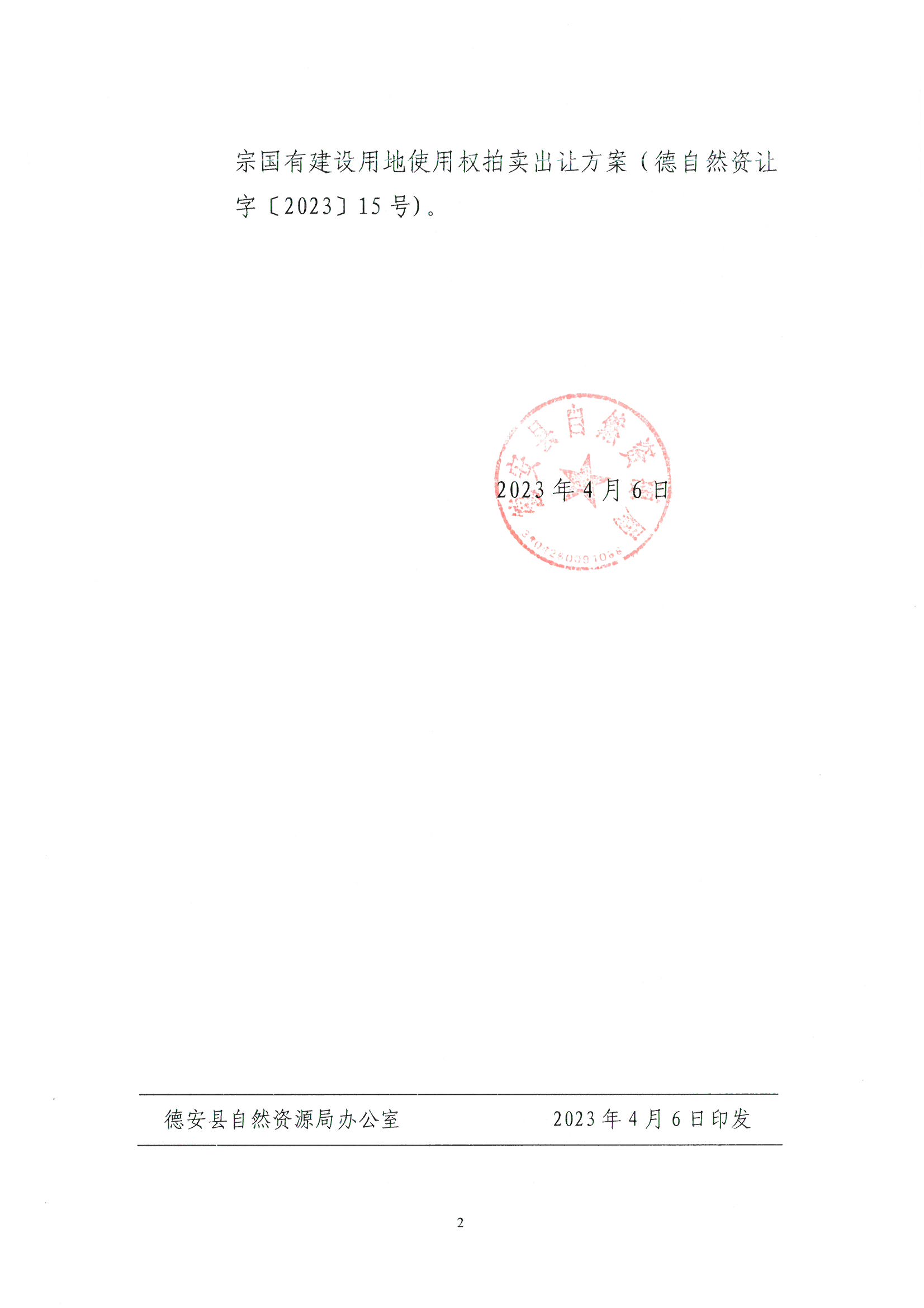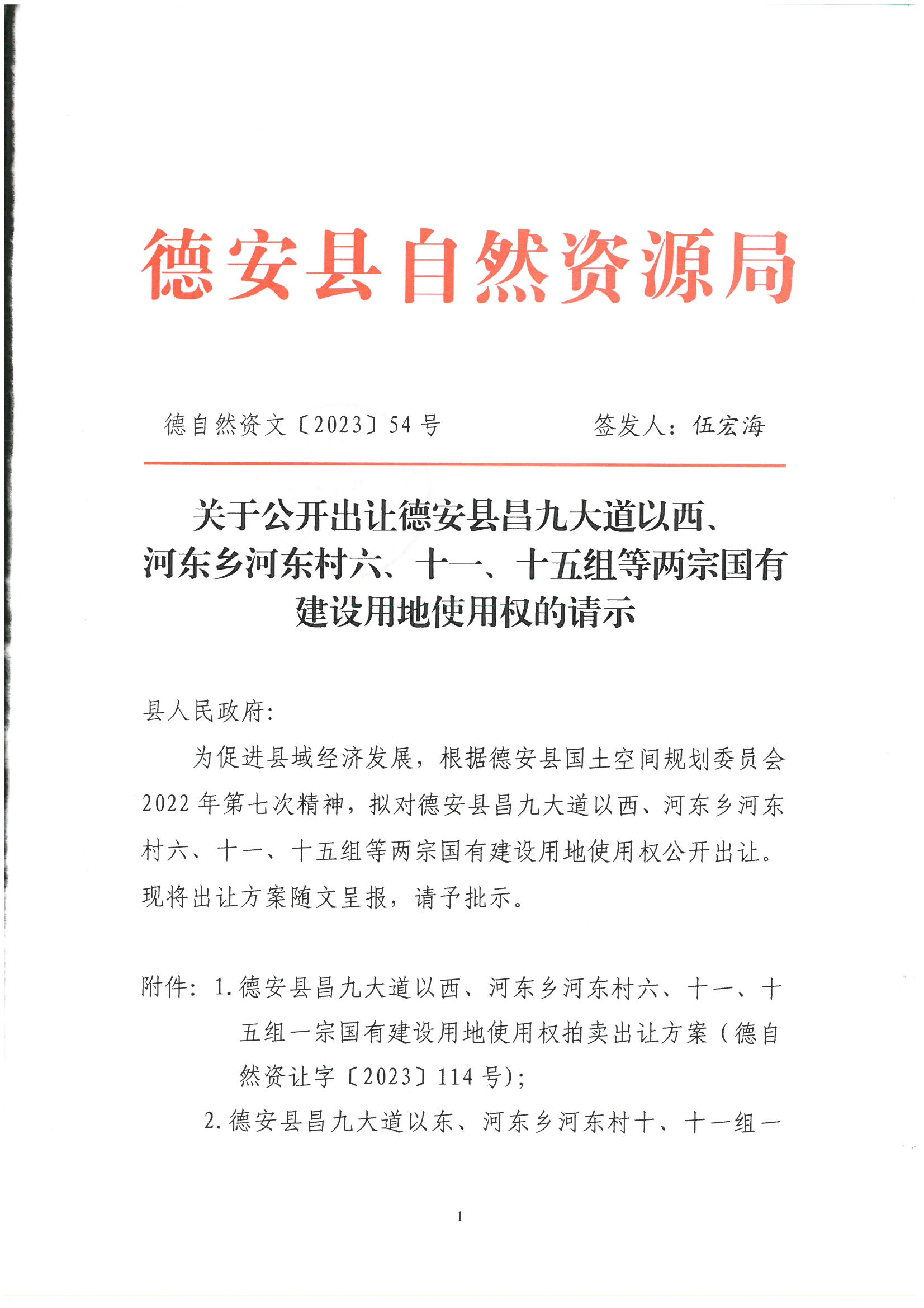 你单位呈报的《关于公开出让德安县昌九大道以西、河东乡河东村六、十一、十五组等两宗国有建设用地使用权的请示》(德自然资文〔2023〕54号)收悉。经研究,同意你单位按所呈报的《德安县昌九大道以西、河东乡河东村六、十一、十五组一宗国有建设用地使用权拍卖出让方案》(德自然资让字〔2023〕14号)、《德安县昌九大道以东、河东乡河东村十、十一组一宗国有建设用地使用权拍卖出让方案》(德自然资让字〔2023〕15号)内容依法出让。