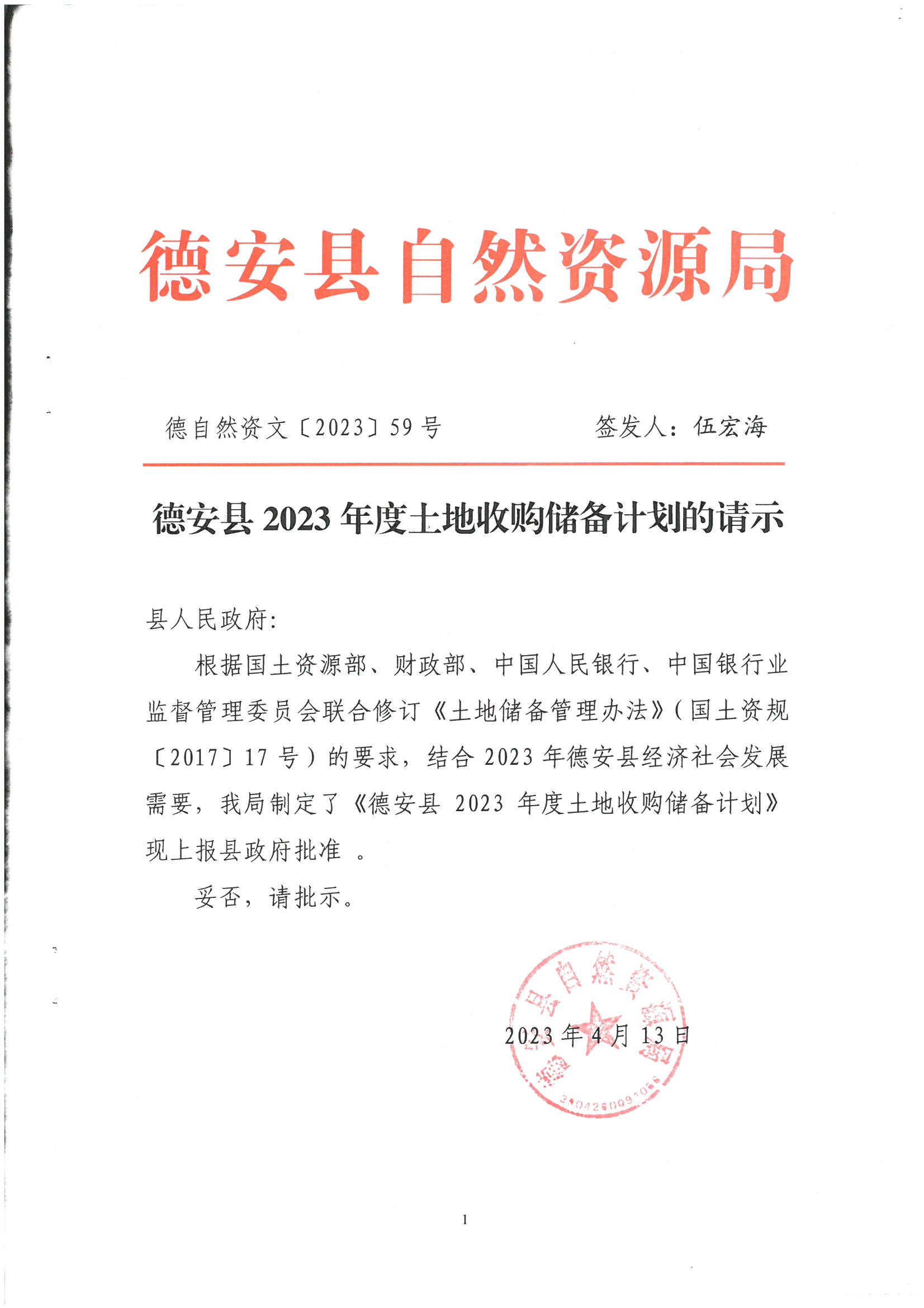 你单位呈报的《德安县2023年度土地收购储备计划的请示》(德自然资文〔2023〕59)收悉。经研究决定,同意你单位的收储计划。请你单位认真适时组织实施,县直相关单位及涉及的各乡(镇)要按照各自职责,密切配合,抓好落实,保证土地收购储备工作顺利开展。