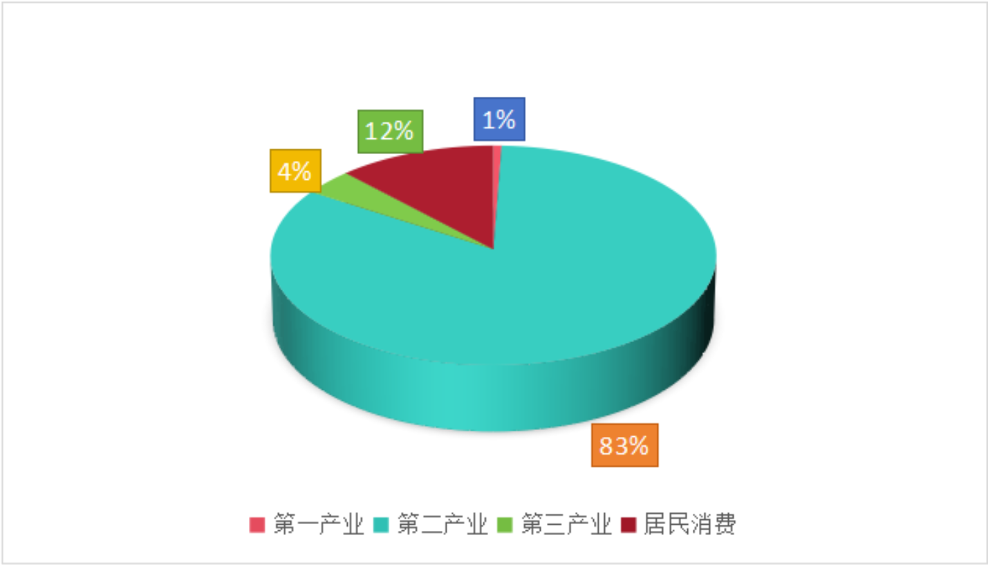 从综合能源消费产业分布看,第二产业是我县能源消费的最大部门,综合能源消费总量达到50.64万tce,占全社会综合能源消费的83%,第一,三产业能源消费量为0.38万tce和2.32万tce,占全社会综合能源消费总量的1%和4%;居民消费总能源消耗量为7.35万tce,占全社会综合能源消费比重约为12%。