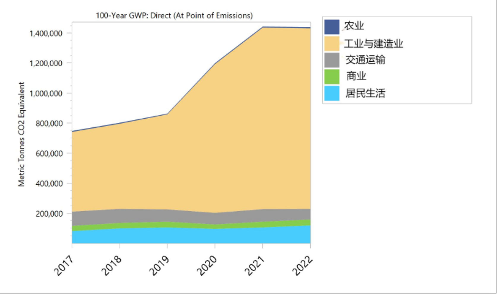 从历史趋势分析来看,2017年到2022年的二氧化碳排放总体趋势(图1-6)呈现逐年递增的态势。2021年相较2019年二氧化碳排放有明显提升,这是受德安县万年青水泥项目的影响。万年青是德安县“十三五”期间引进项目,“十四五”投产达产,2021年综合能源消费量(当量值)达21.95万吨标准煤,一个企业占全县规上工业能耗的45.8%,拉动全县规上工业能源消费量增长31.8个百分点。表1-5-1详细记录了从2017年到2022年各领域二氧化碳排放占比情况,其中,工业与建造业在2020年和2021年有巨大提升,从2019年占总体二氧化碳排放的73.31%提高到了2021年的83.73%;居民生活领域的二氧化碳排放量总体呈现上升趋势;商务服务业2020年和2021年这两年由于受疫情影响,二氧化碳排放量较2019年略有下降,在2022年又有所提高达到了3.95万吨二氧化碳。