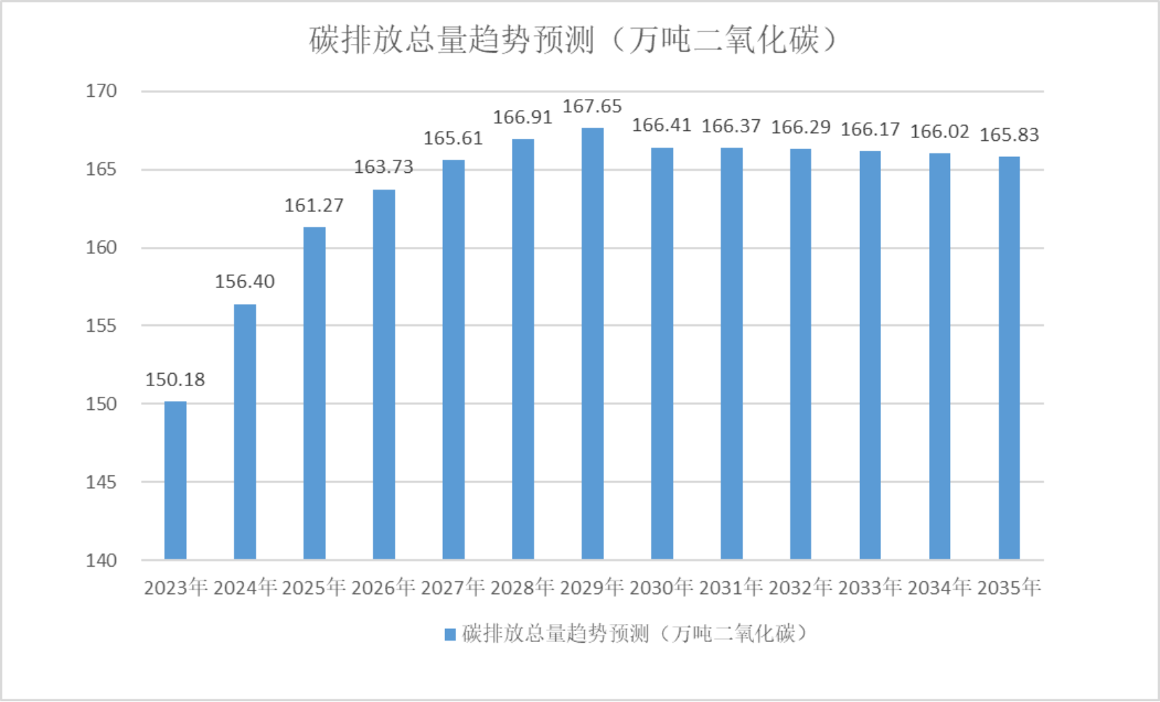 根据LEAP-德安模型,结合经济发展数据指标及碳排放实际数据分析,德安县在达峰情景下将于2030年前年达峰,碳排放峰值总量为167.65万吨2。碳排放峰值预测的趋势如下图: