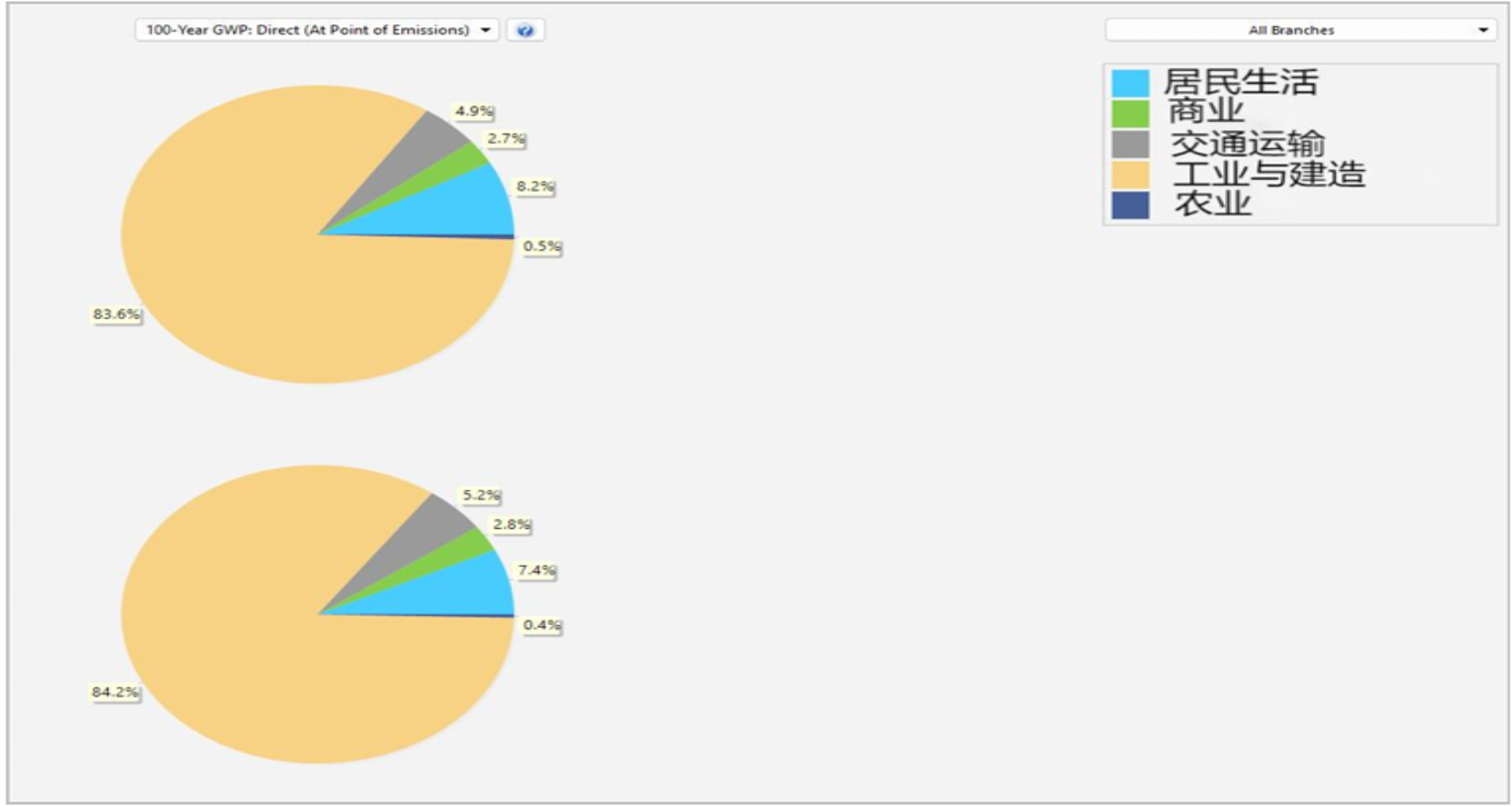 从产业结构来看,目前德安县的碳排放集中在第二产业(包括工业领域和建筑生产),达到了120.27万吨二氧化碳,占总二氧化碳排放量的83.6%,第二产业的二氧化碳排放主要以电力和煤炭的排放为主。