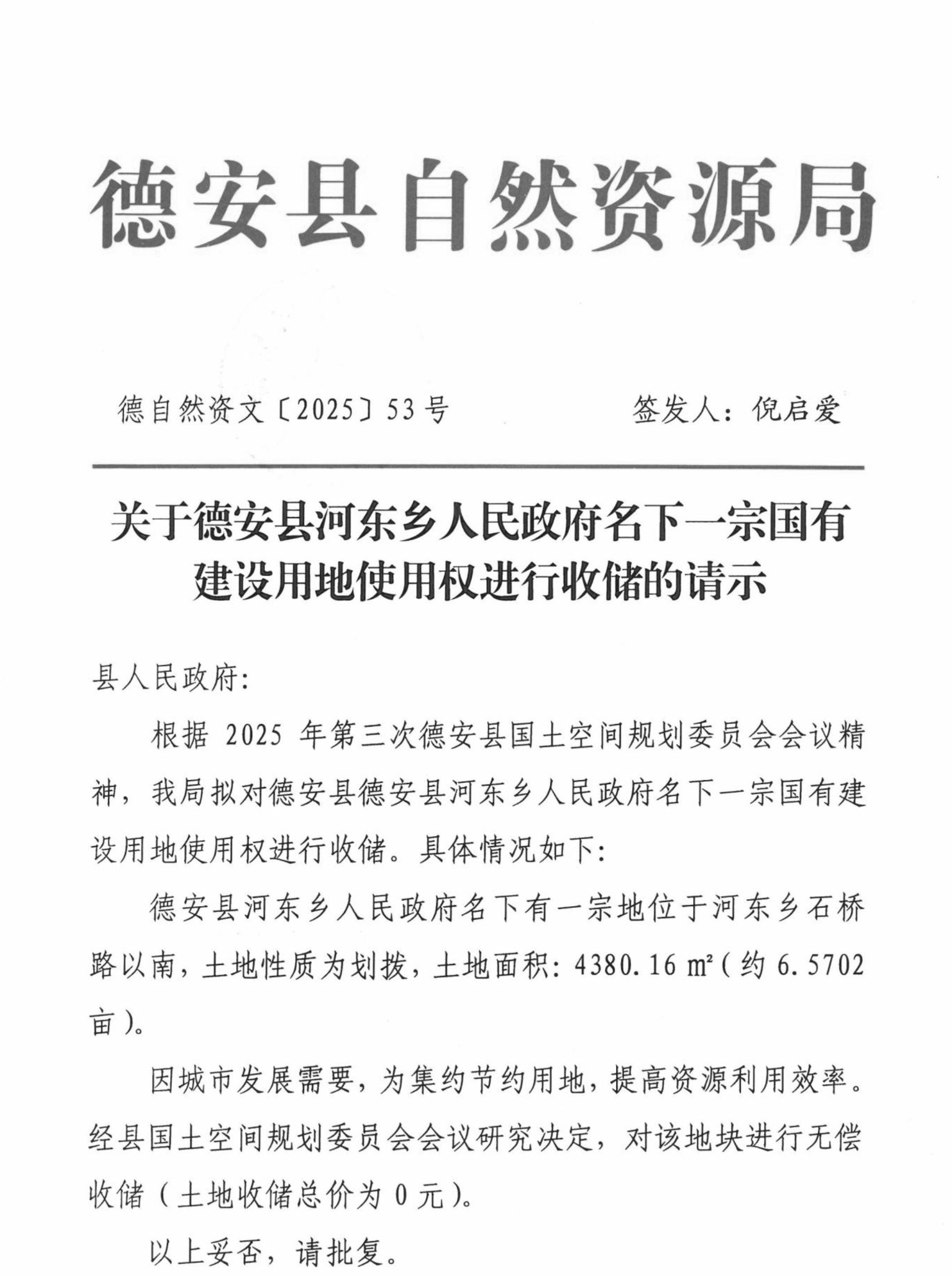 你单位呈报的《关于德安县河东乡人民政府名下一宗国有建设用地使用权进行收储的请示》(德自然资文〔2025〕53号)已收悉。经县政府研究决定,同意你单位进行无偿收储的请示,请依法依规做好相关收储工作。