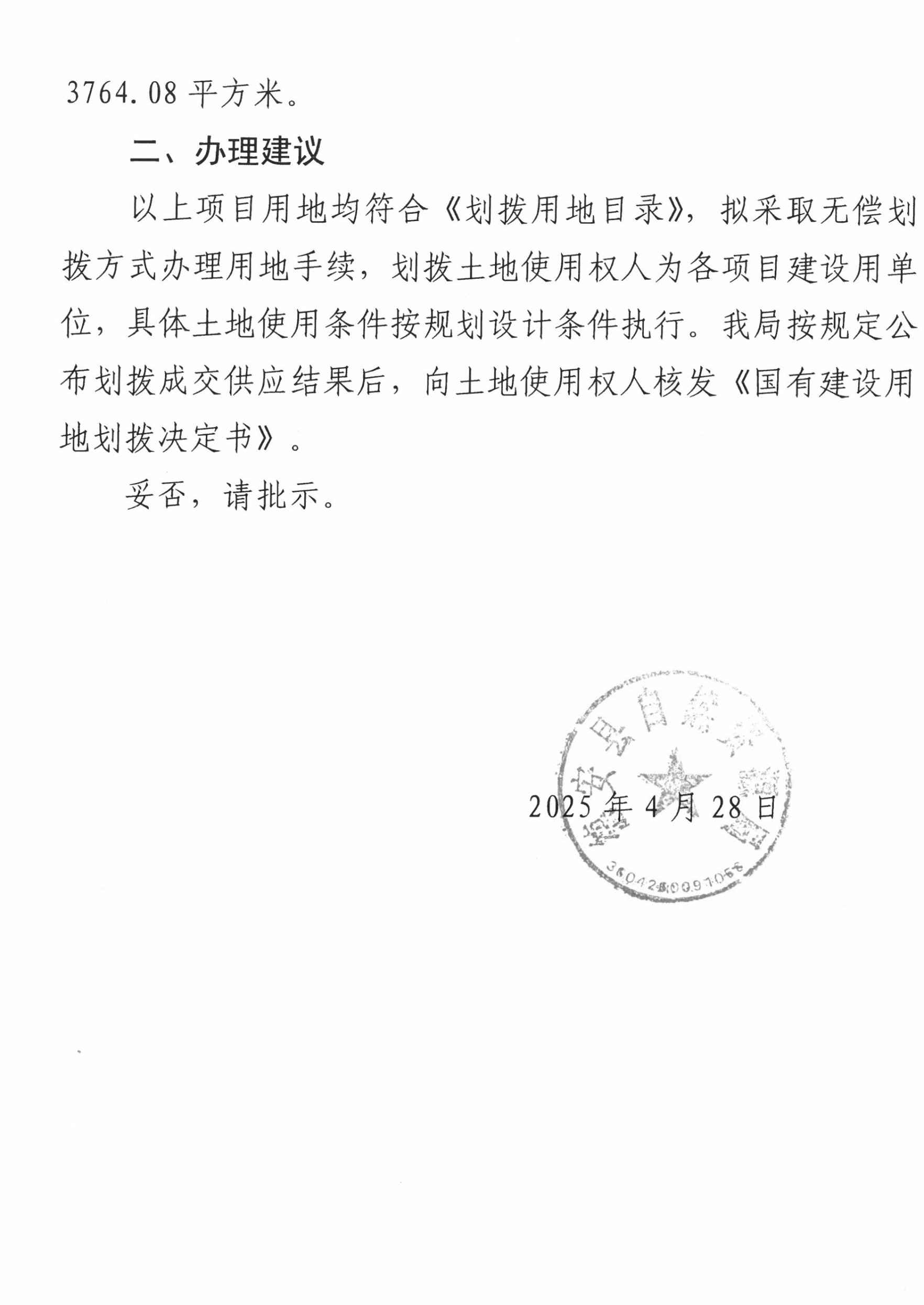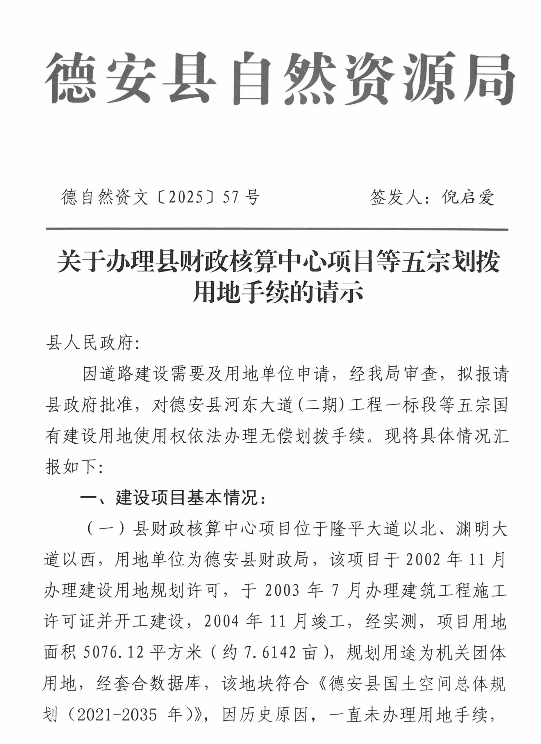 你局呈报的《关于办理县财政核算中心项目等五宗划拨用地手续的请示》(德自然资文〔2025〕57号)已收悉。经县政府研究决定:1.同意对县财政核算中心项目办理无偿划拨用地手续,土地使用权人为德安县财政局,土地用途为机关团体用地;2.同意对河东大道(二期)工程二标段项目西外环路(三中至渊明大道延伸线)、体育路、一小规划路、东支路等四条道路办理无偿划拨用地手续,土地使用权人为德安县绿色道路项目管理有限公司,土地用途为村镇村道路用地。