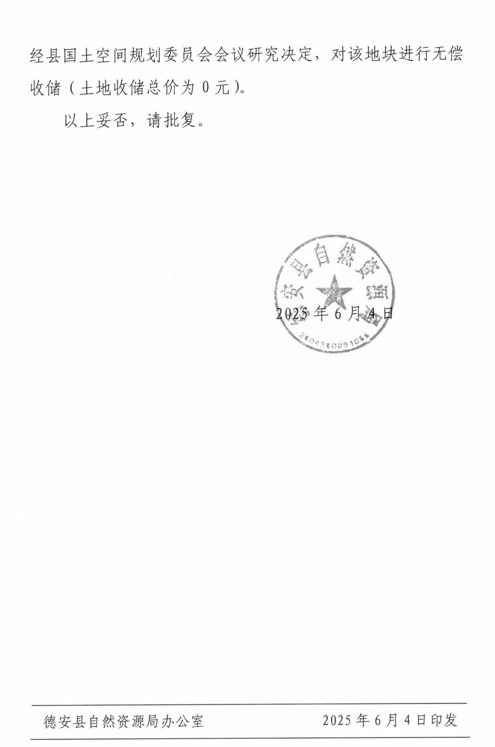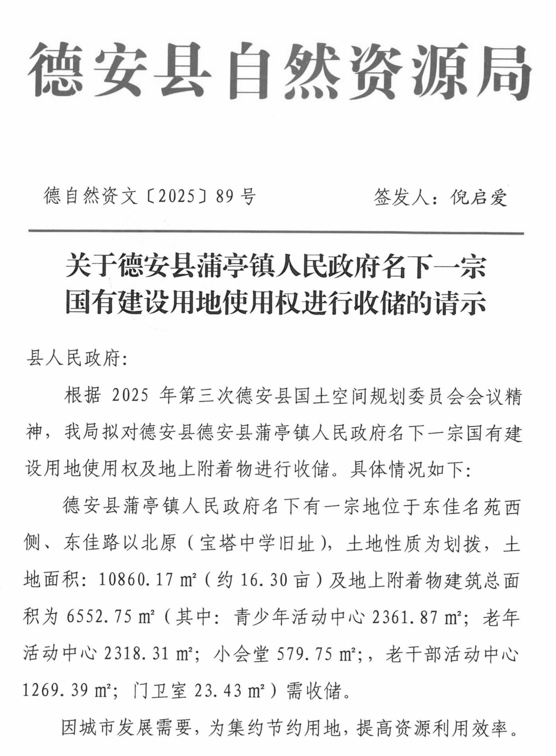 你单位呈报的《关于德安县蒲亭镇人民政府名下一宗国有建设用地使用权进行收储的请示》(德自然资文〔2025〕89号)已收悉。经县政府研究决定,同意你单位进行无偿收储的请示,请依法依规做好工作。