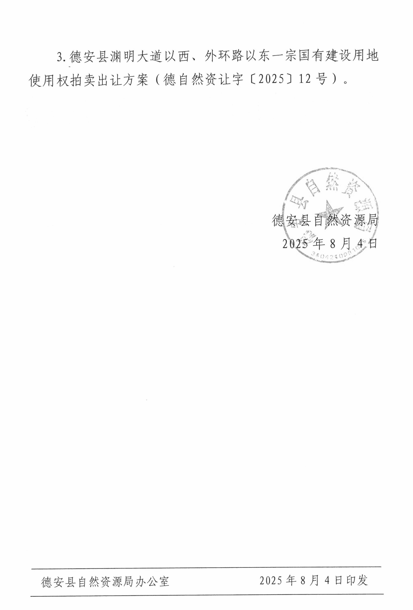 你单位呈报的《关于公开出让德安县共安大道以东、文华大道以南等三宗国有建设用地使用权的请示》(德自然资文〔2025〕120号)已收悉。经研究,同意你单位按所呈报的《德安县共安大道以东、文华大道以南一宗国有建设用地使用权拍卖出让方案》(德自然资让字〔2025〕10号)、《德安县陈家湾大道以南、共安北大道以西一宗国有建设用地使用权拍卖出让方案》(德自然资让字〔2025〕11号)、《德安县渊明大道以西、外环路以东一宗国有建设用地使用权拍卖出让方案》(德自然资让字〔2025〕12号)内容依法依规出让。