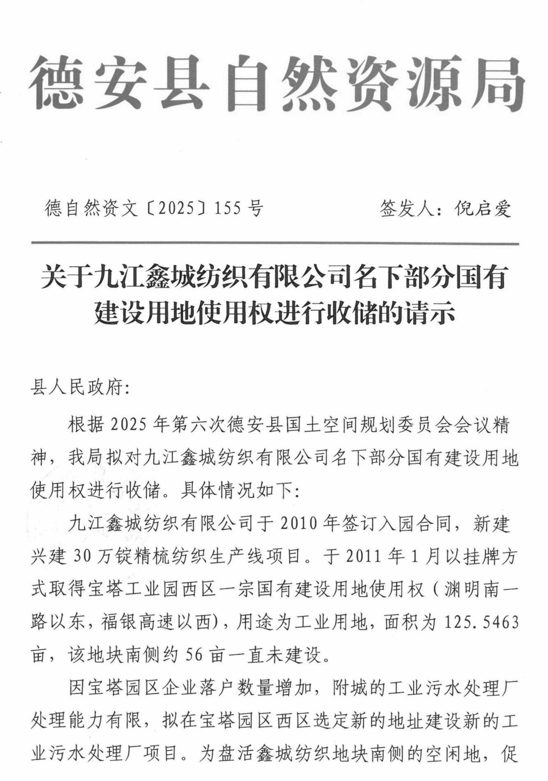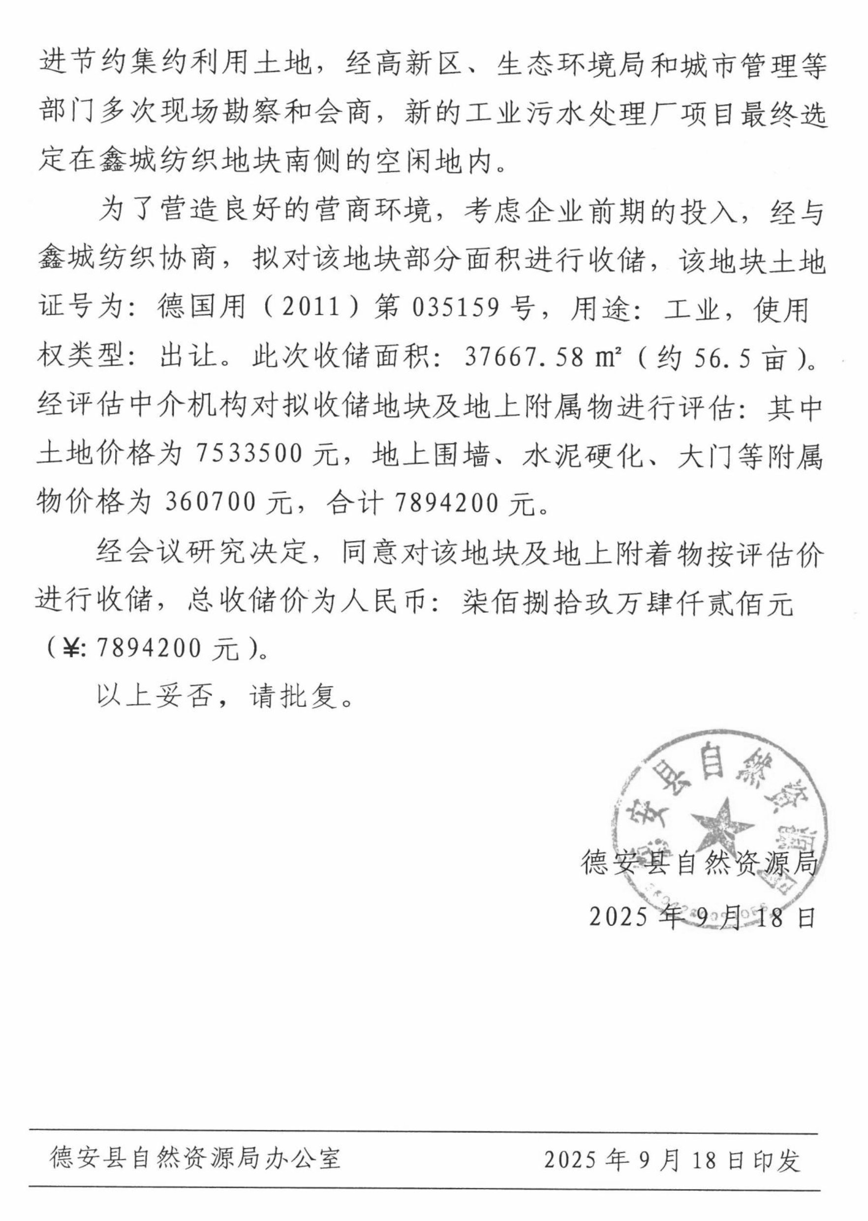 你单位呈报的《关于九江鑫城纺织有限公司名下部分国有建设用地使用权进行收储的请示》(德自然资文〔2025〕155号)已收悉。经县政府研究决定,同意你单位进行收储,总收储价为人民币:柒佰捌拾玖万肆仟贰佰元(¥:7894200元)。请依法依规做好工作。